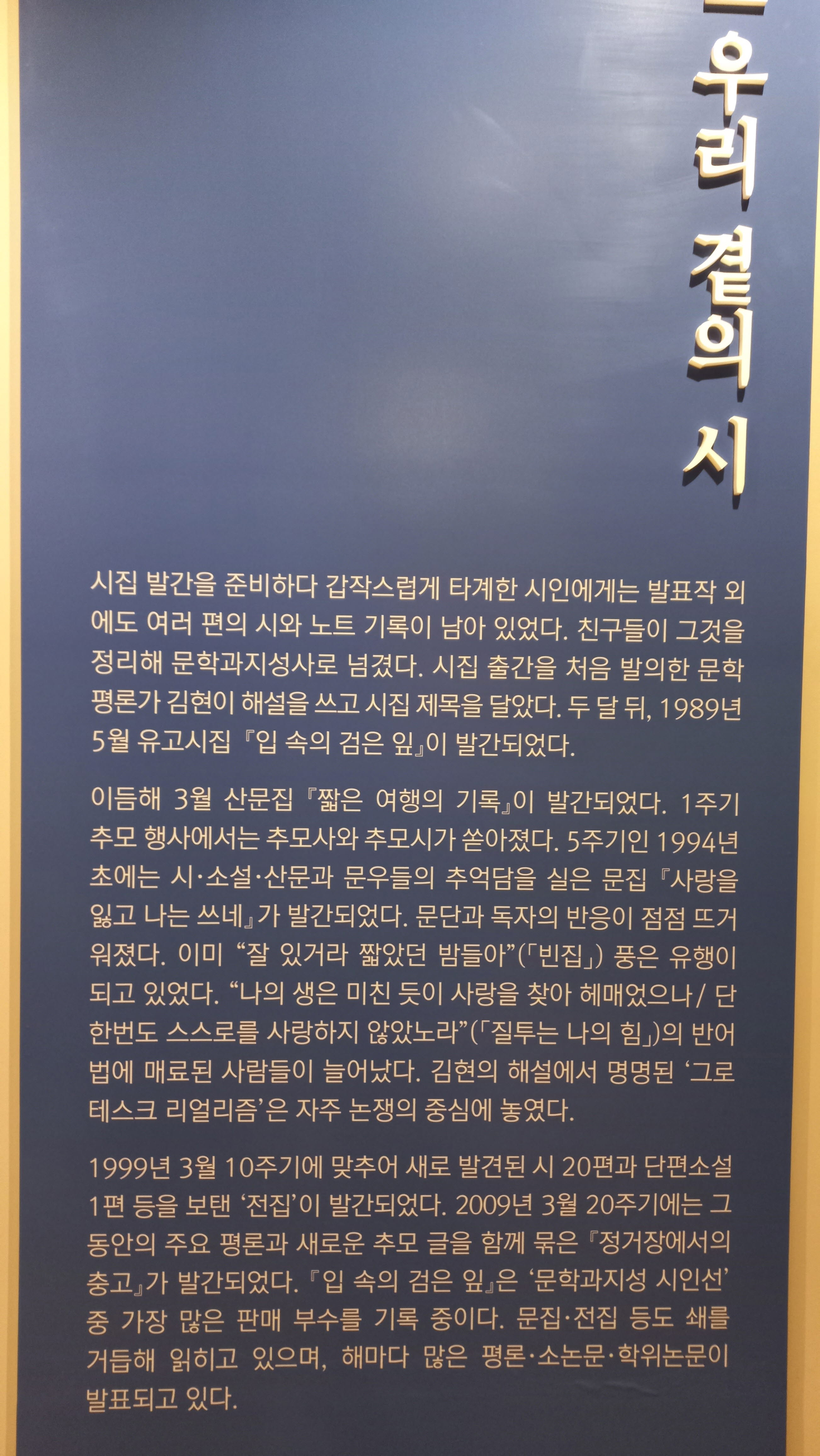 1989년 사망 두 달 뒤에 그의 유고시집 '입 속의 검은 잎'이 나오게 되었고, 이듬해 3월 산문집 '짧은 여행의 기록'이 발간되었습니다.