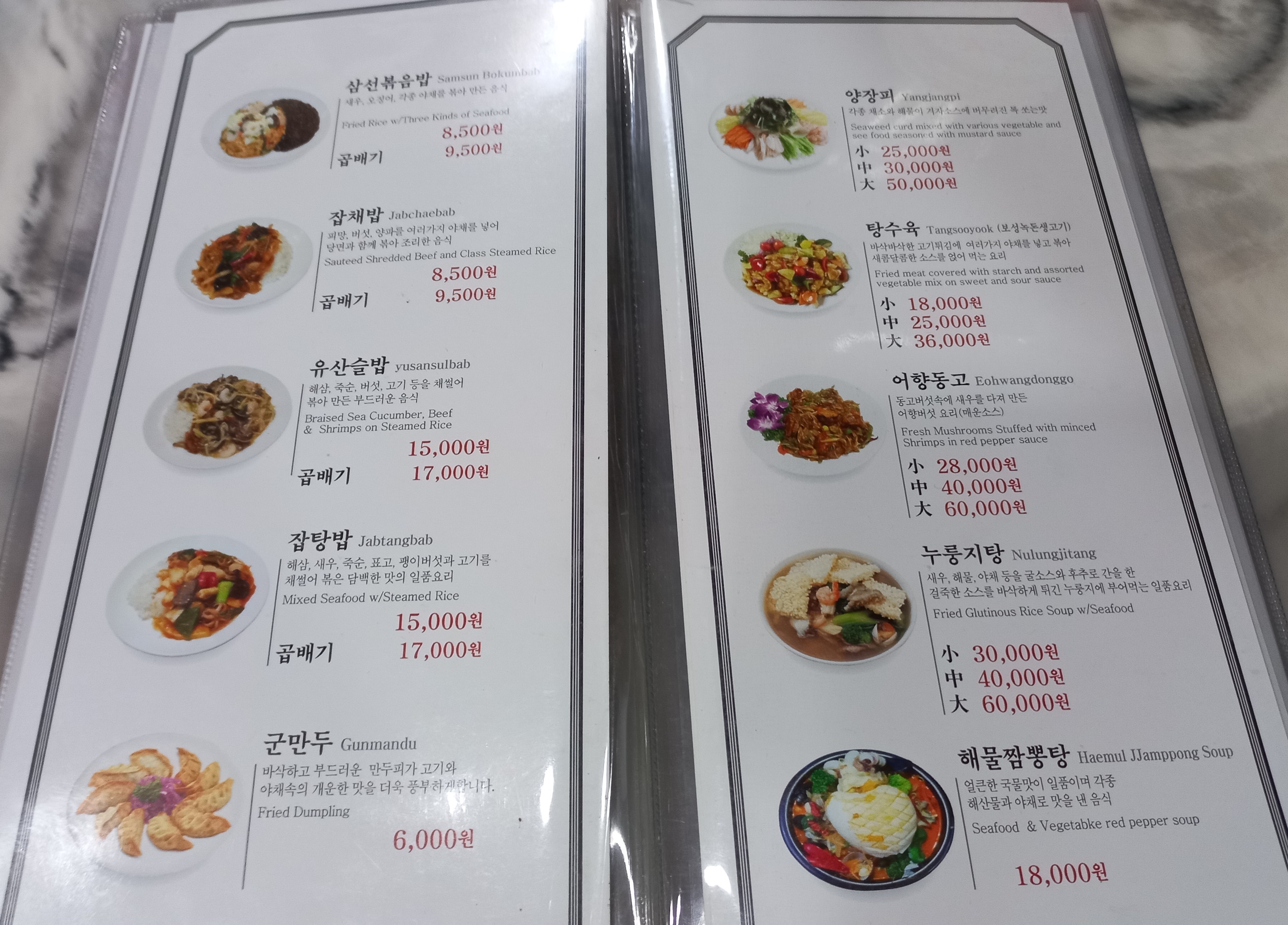 기타 갑오징어짬뽕(13000)과 쟁반짜장(18000~36000) 등이 있고 곱빼기는 1,000원이 추가됩니다.