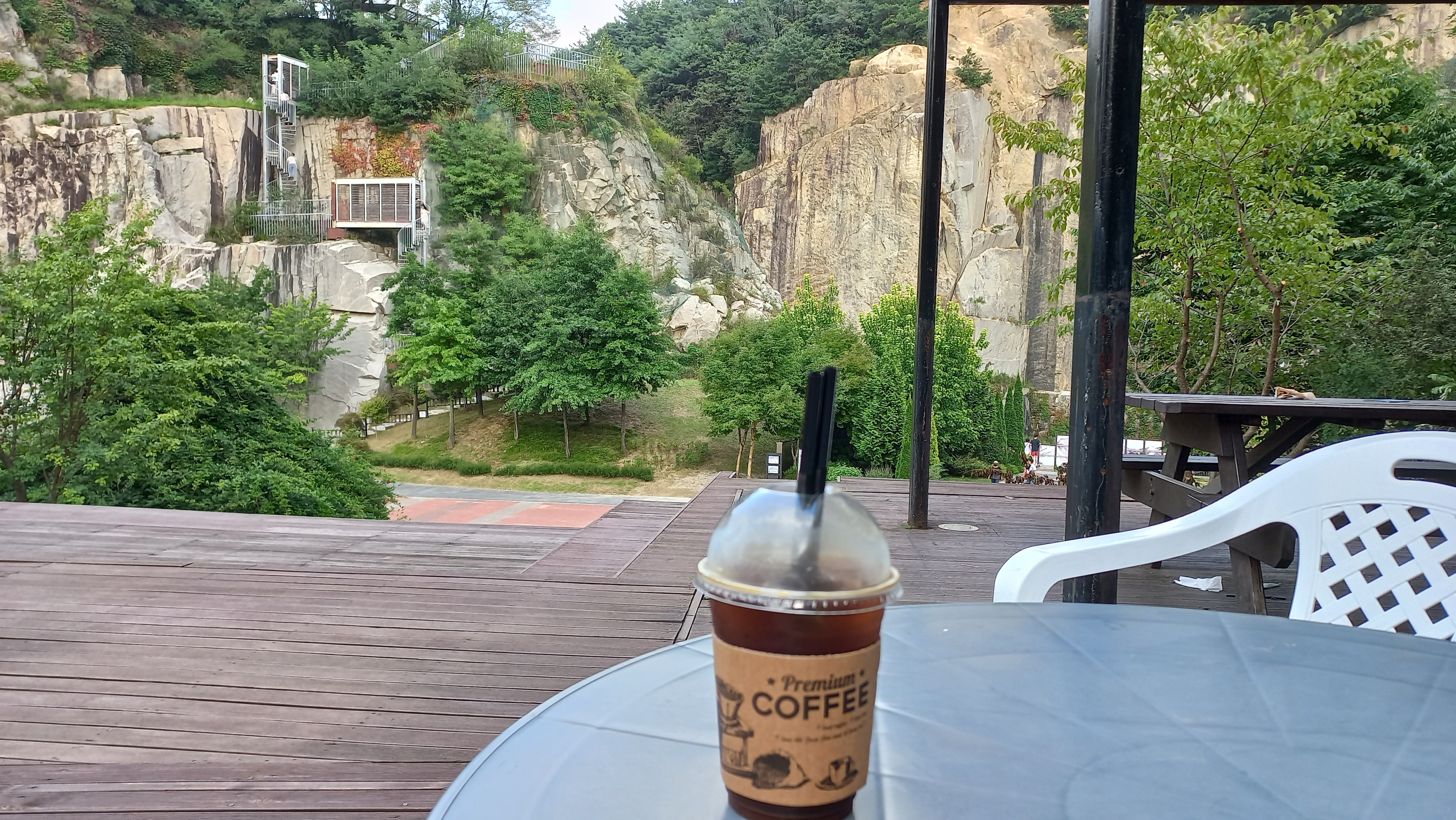 전망카페 야외테이블에 자리하여 채석장 풍경을 보기로 했습니다.