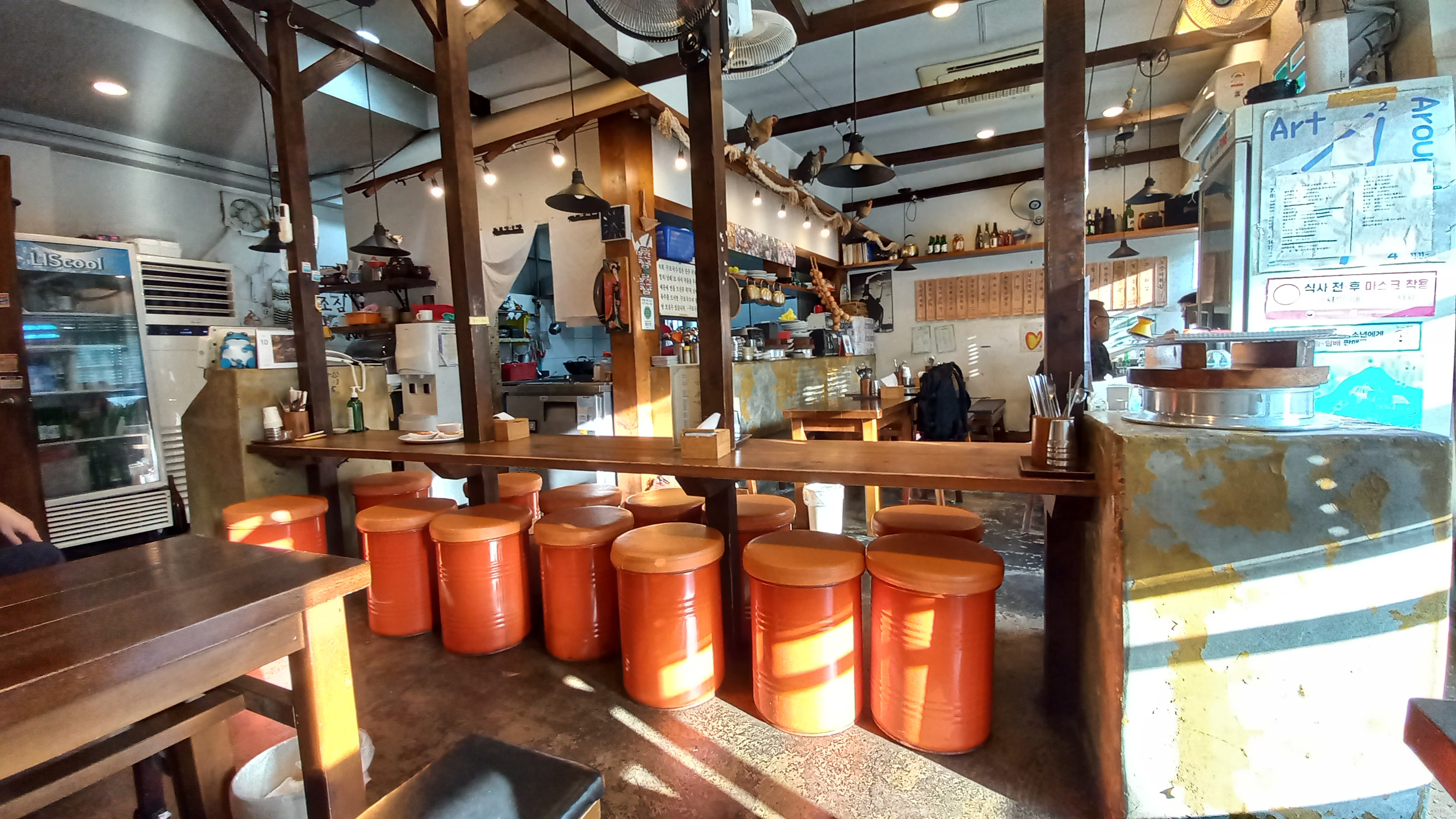 주방이 있고 홀에 많은 테이블이 준비되어 있는데, 세련된 모습 대신 정겨움이 많이 묻어나는 옛날 식당 같은 풍경입니다.