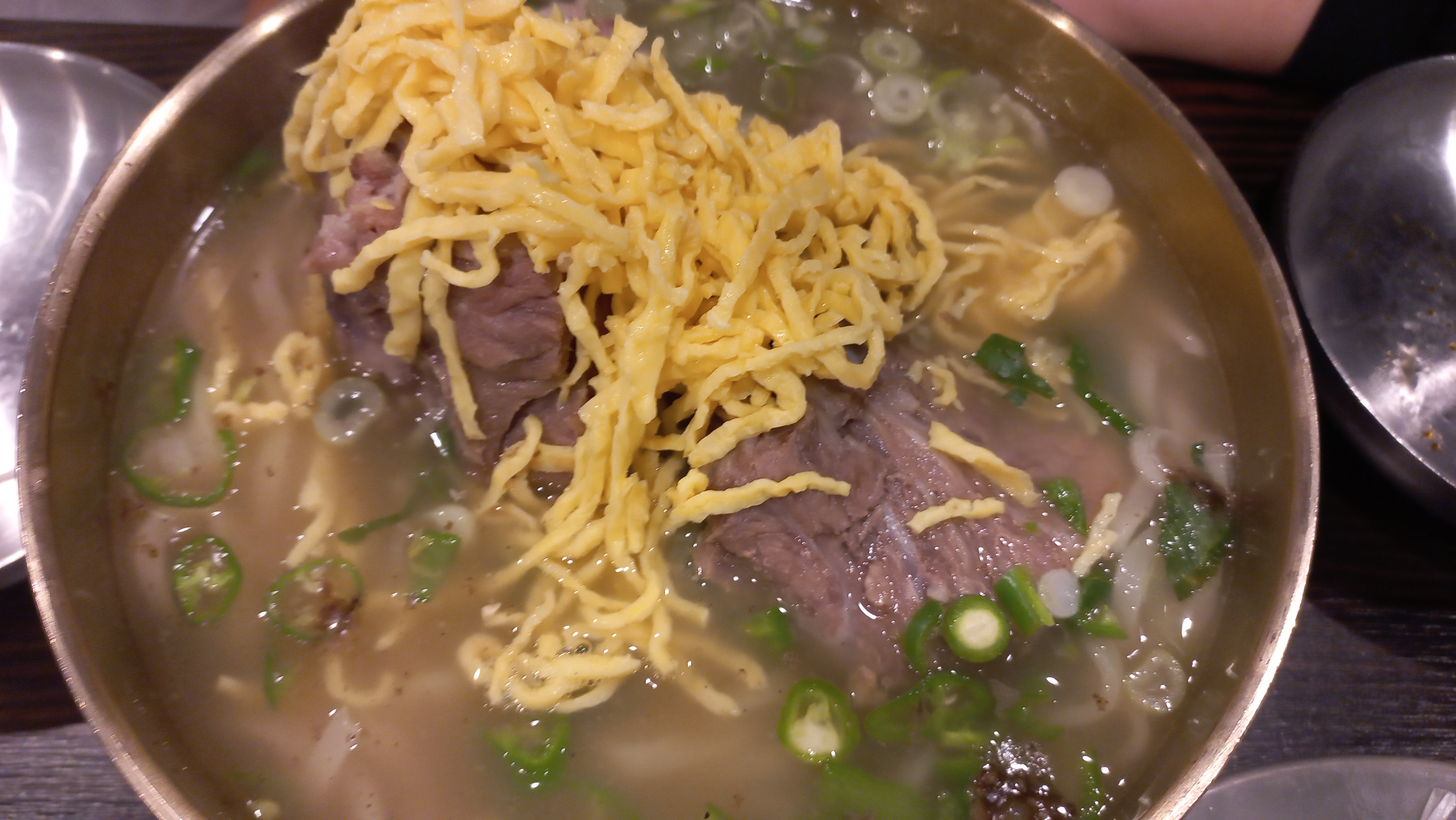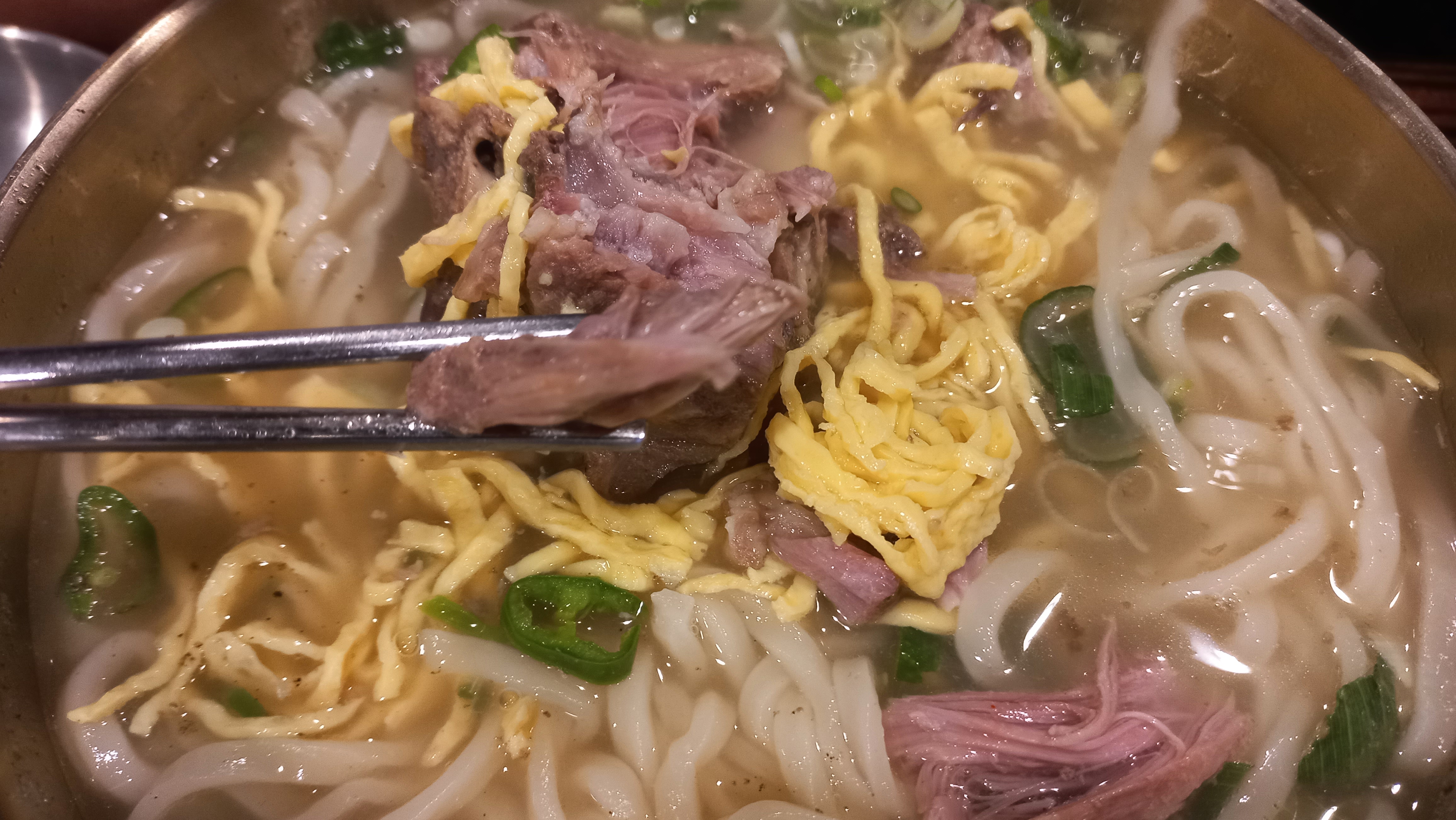 노란 지단과 칼국수와 목뼈로 만든 육수가 들어 있습니다.
