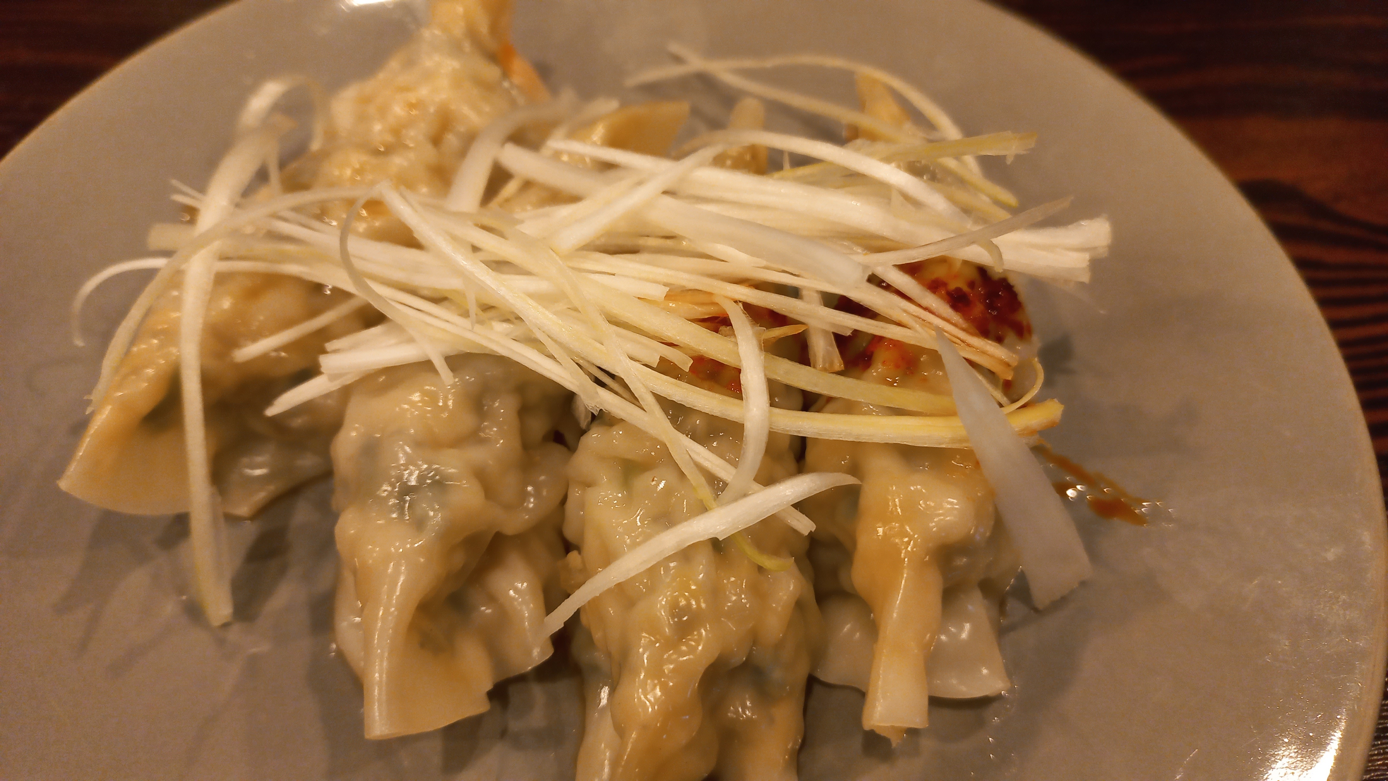 새우만두는 얇은 피 안에 통통한 새우와 담백한 소에 고추기름과 파채를 얹은 수제만두이고요.