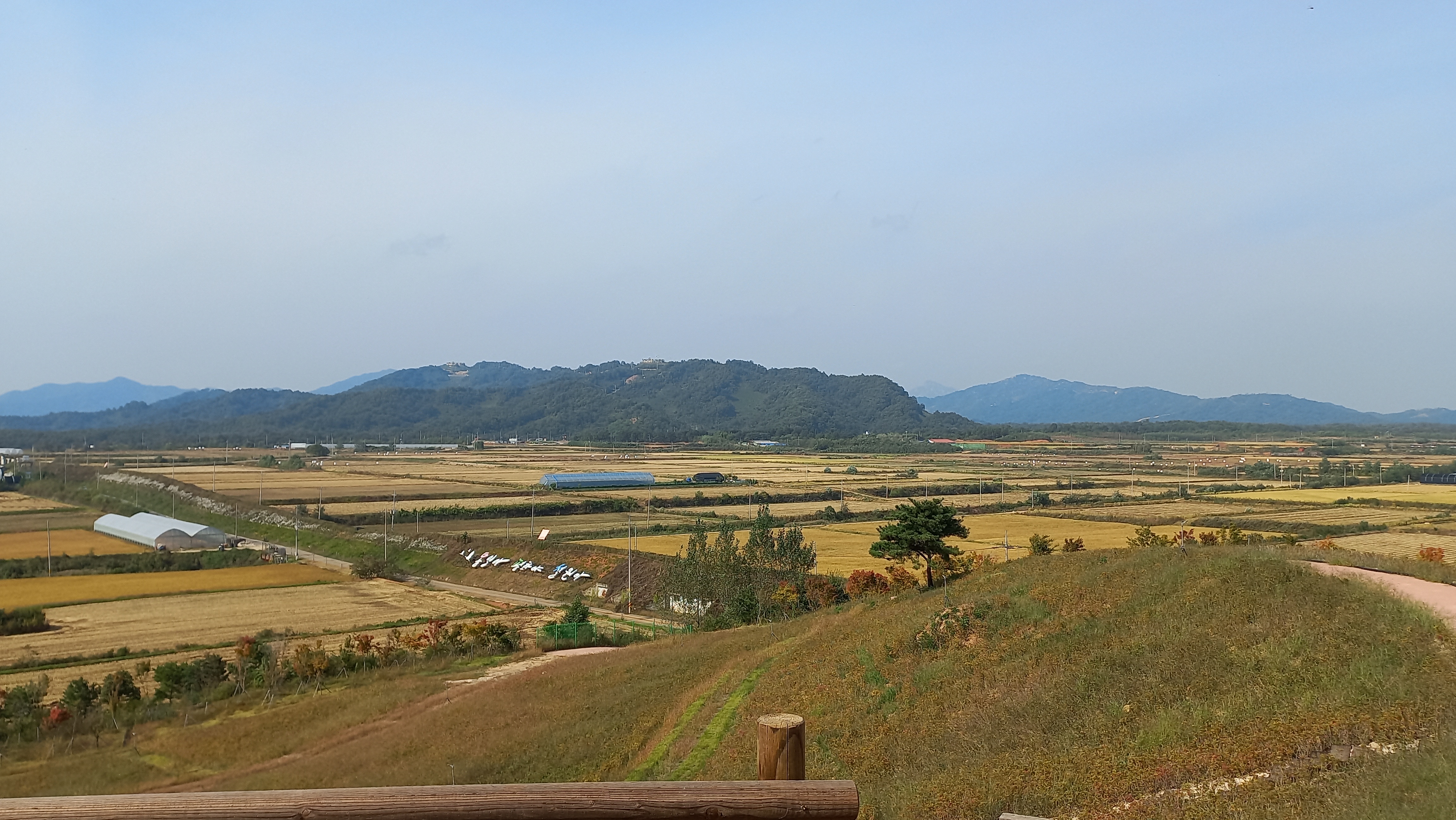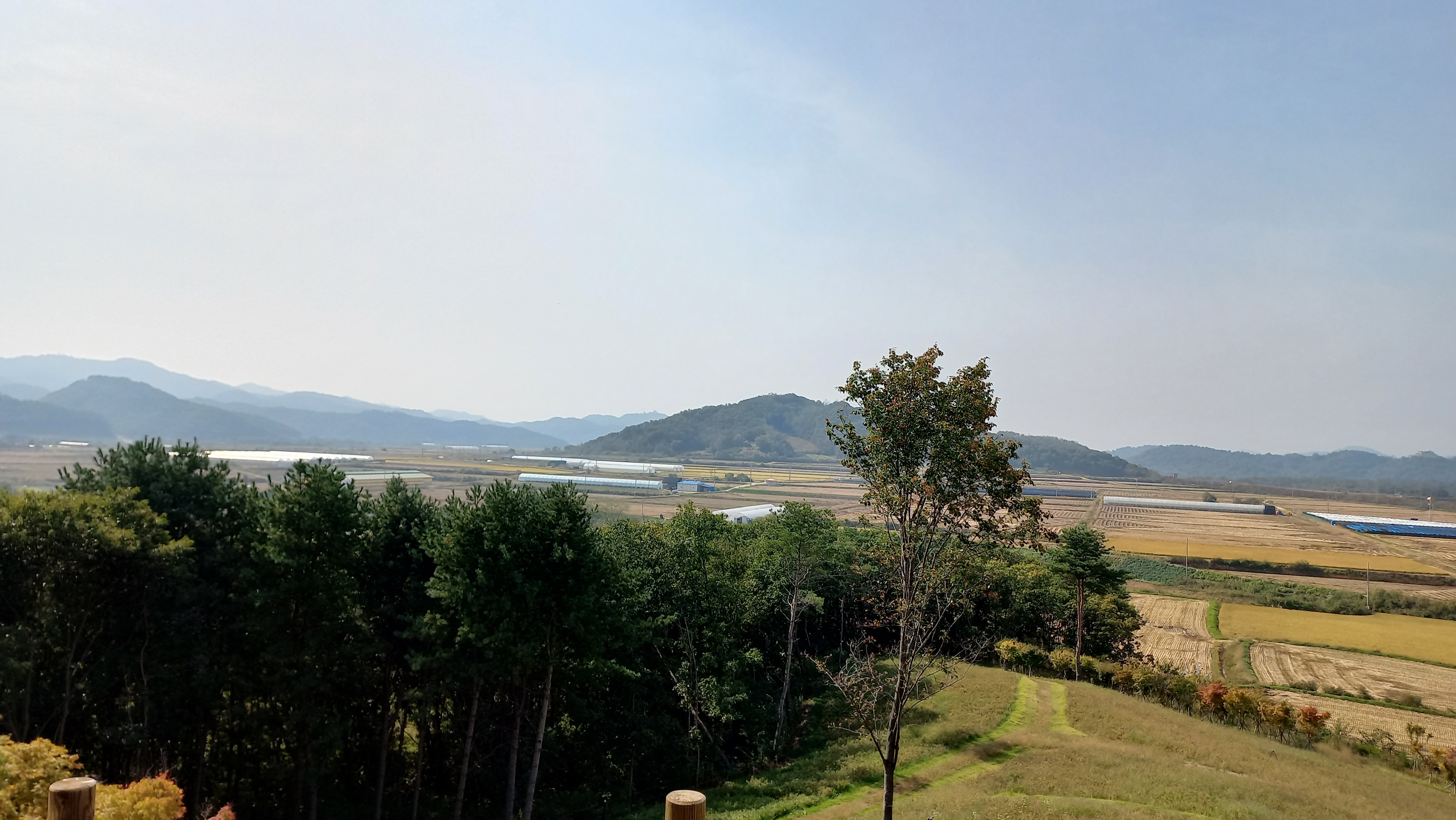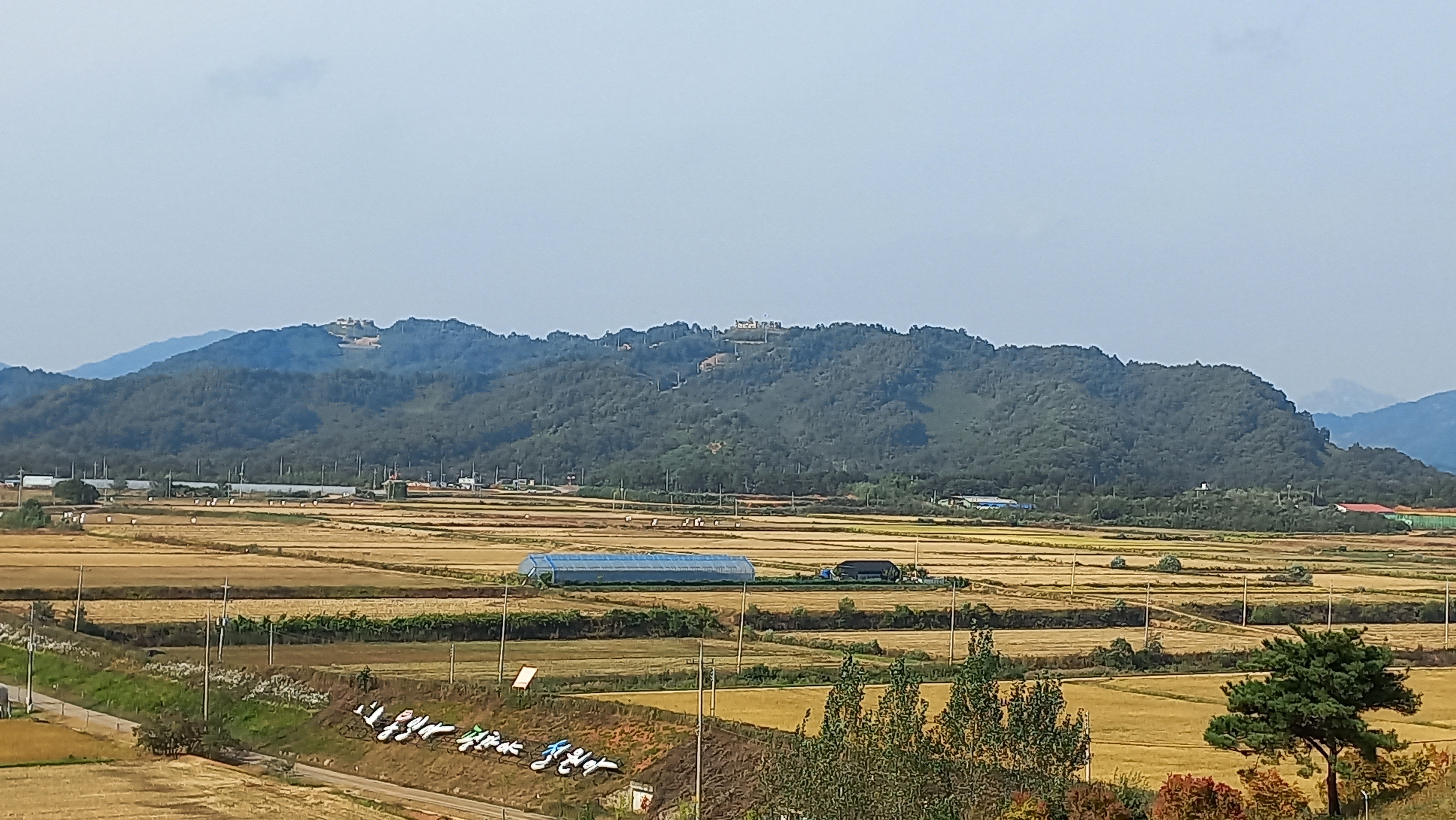선명하게 보이는 산은 남한땅이고, 그 뒤에 희미하게 보이는 곳은 북한 땅입니다.