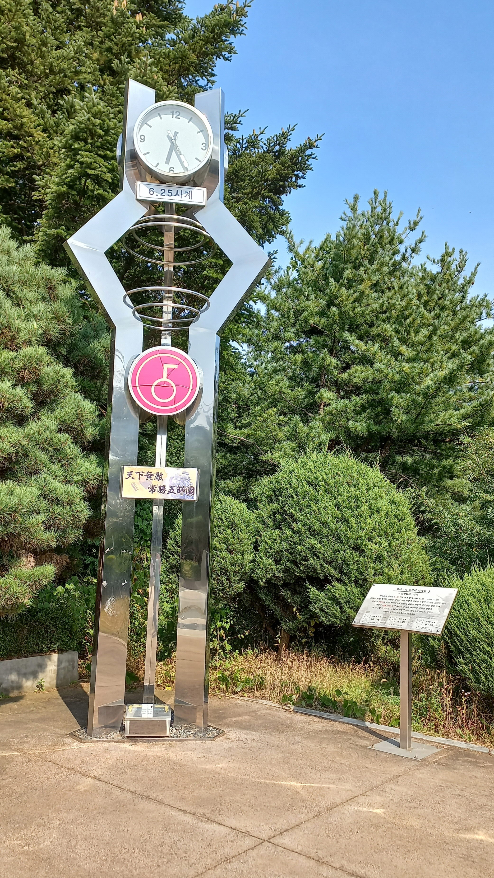 이 상징 시계탑에는 세 개의 시계가 멈춰 있는데, 좌측면 시계는 우리 국군이 백마고지 전투에서 승리한 일자를 의미하는 10:15, 전면 시계에는 6.25 한국전쟁을 의미하는 6:25, 우측면 시계는 한국전 참전 9사단과 현 5사단 책임지역임을 나타내는 9:05에 시간이 멈춰 있습니다.