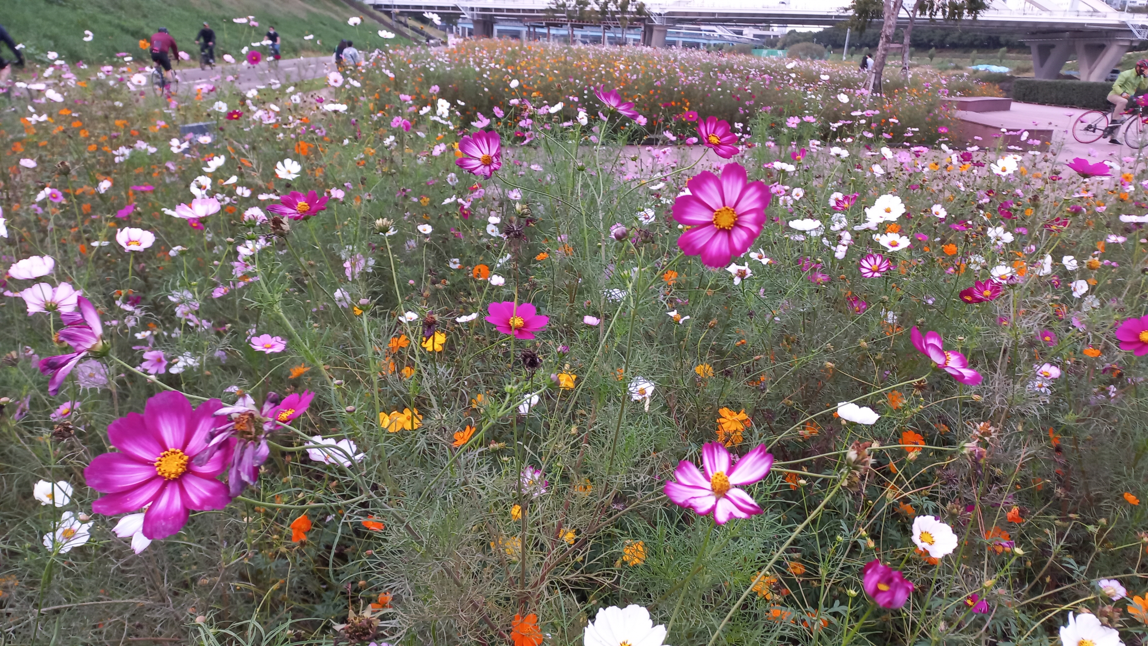 목동교 쪽에 있는 라이딩 코스에 울긋불긋 코스모스가 장관을 이루고 있습니다.