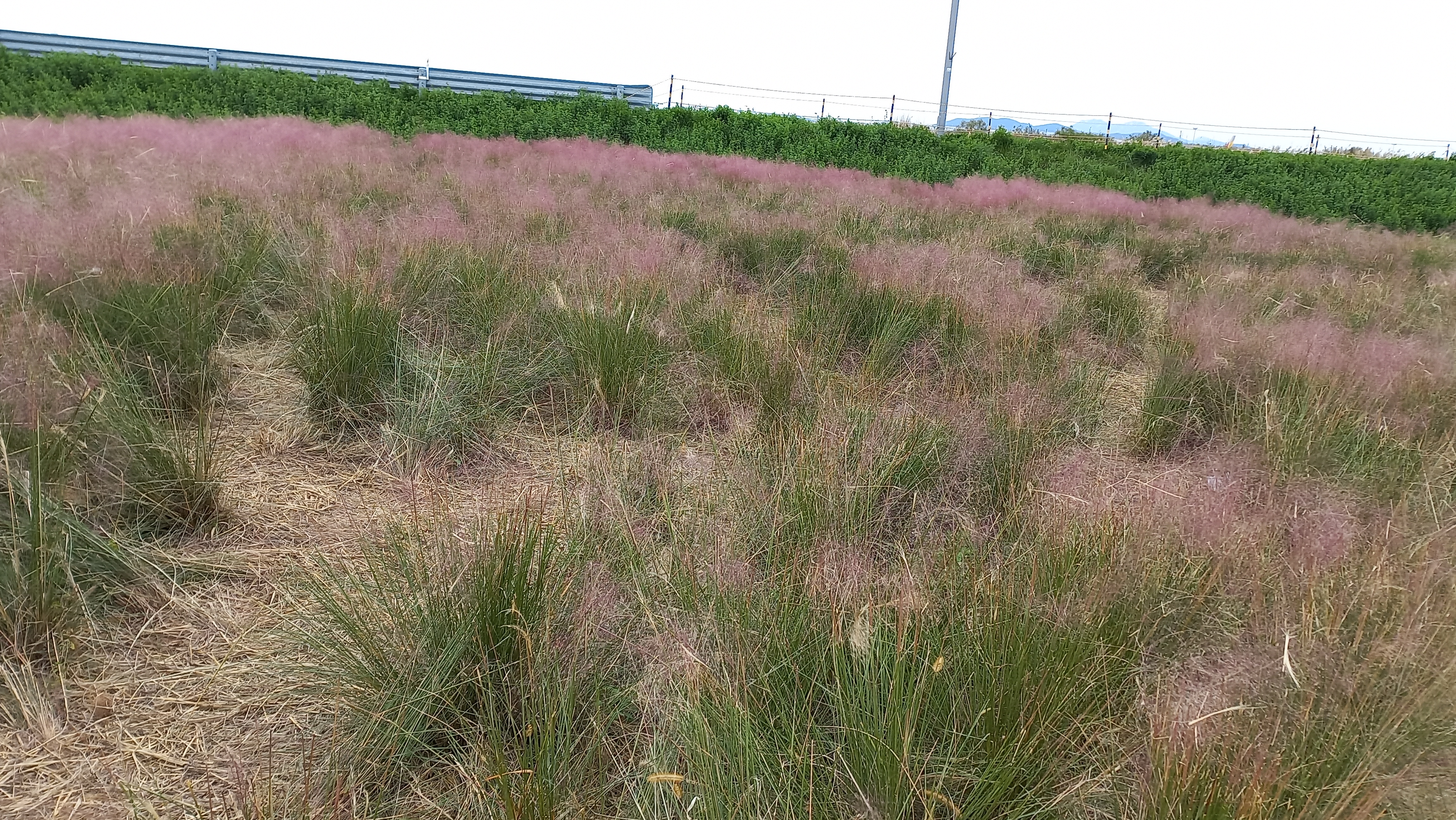 징검다리를 건너면 작고 화려하지 않은 핑크뮬리가 있습니다.