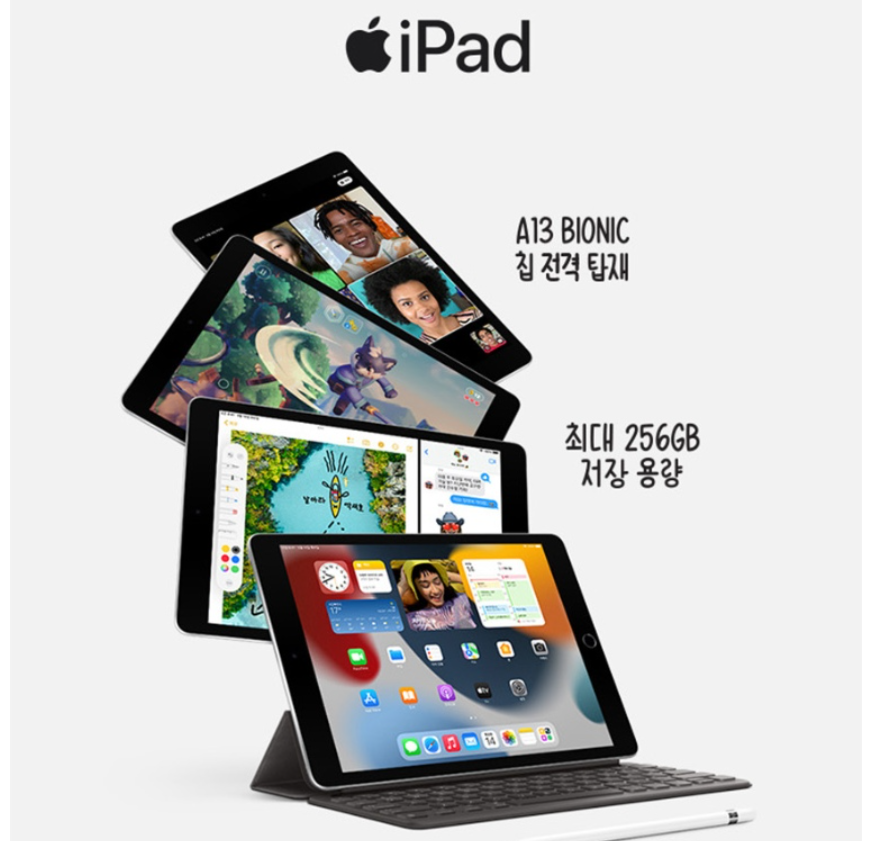 아이패드 9세대는 강력한 성능에 간편함과 다재다능함을 갖추면서 가격은 상대적으로 저렴하게 책정해 코로나 시대에 비대면 작업과 공부, 소통을 위해 전략적으로 애플에서 출시한 제품으로 보입니다.
