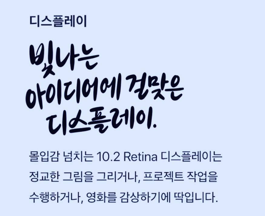이번 아이패드 9세대는 시리즈 최초로 투루톤 기술(어떤 조명에서도 눈을 편하게 해주는 기술)이 적용된 26cm(10.2인치) 레티나(Retina : 망막) 디스플레이가 탑재되었습니다.