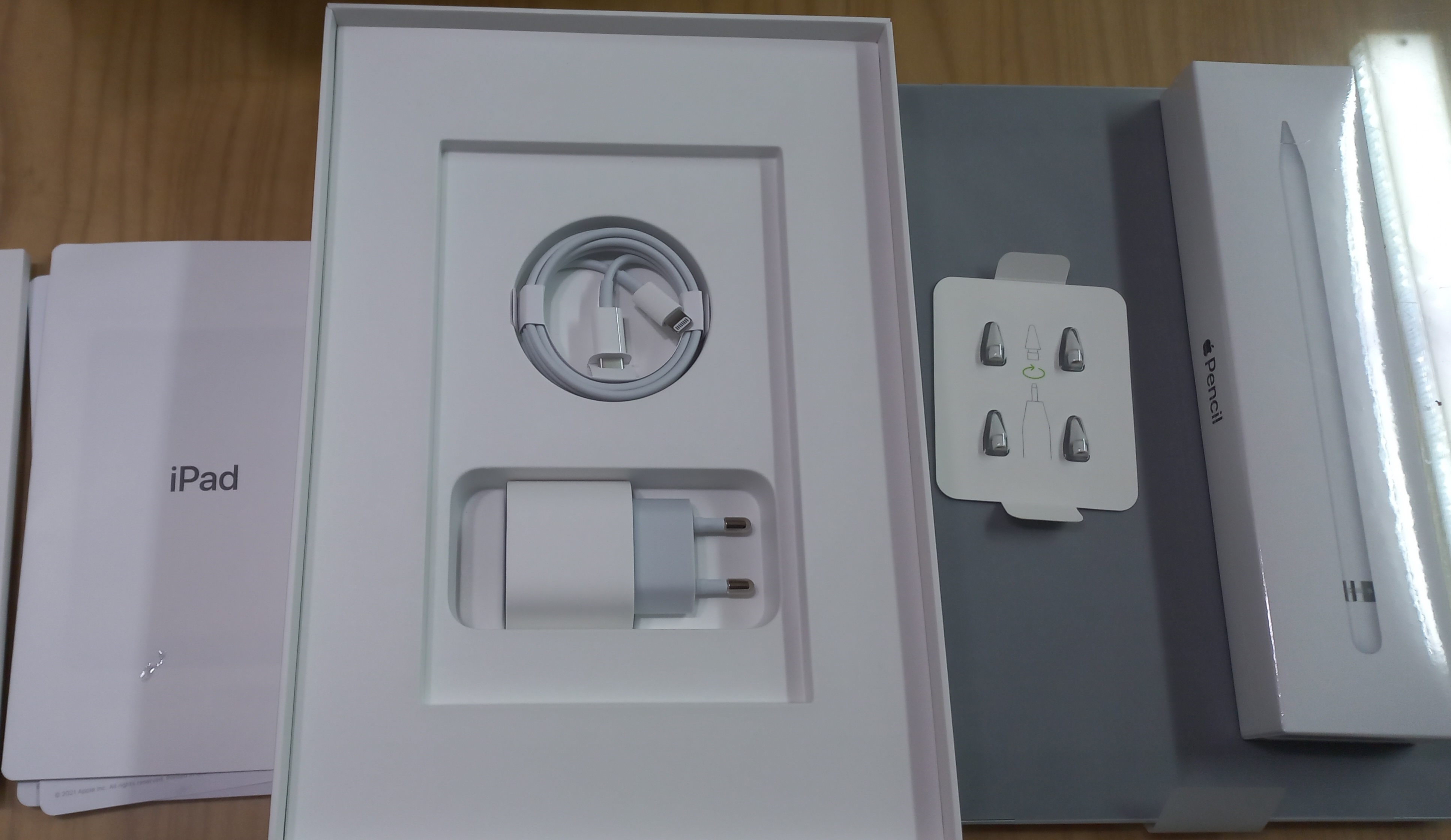 아이패드와 함께 딸려오는 충전기에 데이터 케이블, 애플펜슬(추가구입), 그리고 애플펜슬립(추가구입)입니다.