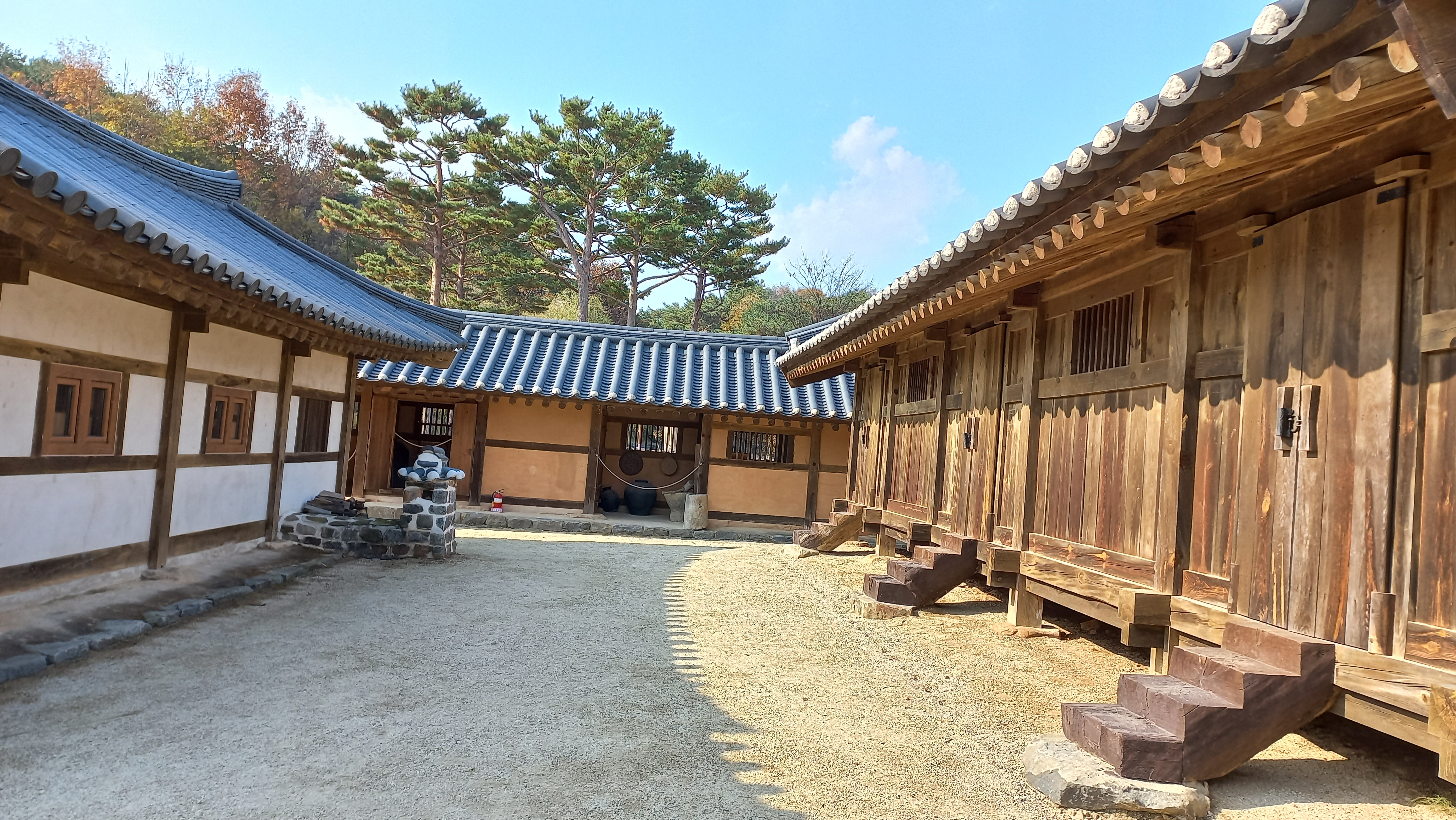 위쪽에는 초가지붕이 있는 마을, 아래쪽에는 한옥으로 이루어진 마을인데요.