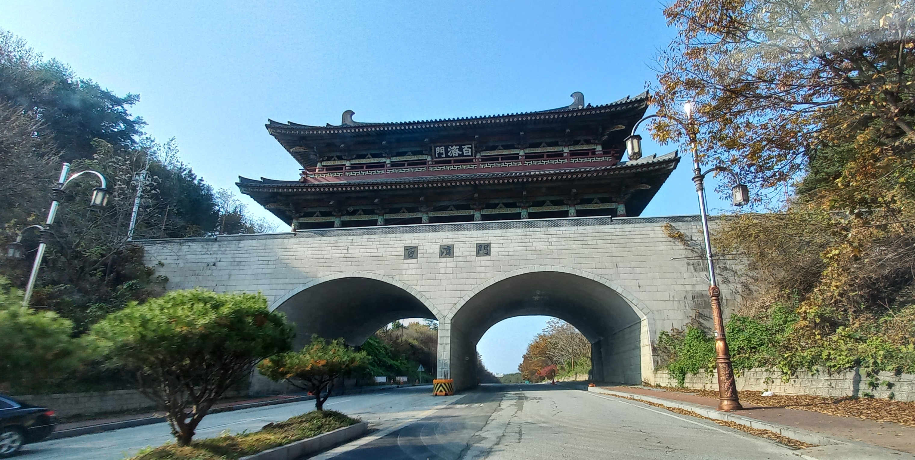 백제문화단지는 부여군 규암면 합정리에 위치하며, 백마강교를 건나오다 보니 입구에 백제문이라는 거대한 대문이 맞이해 줍니다.