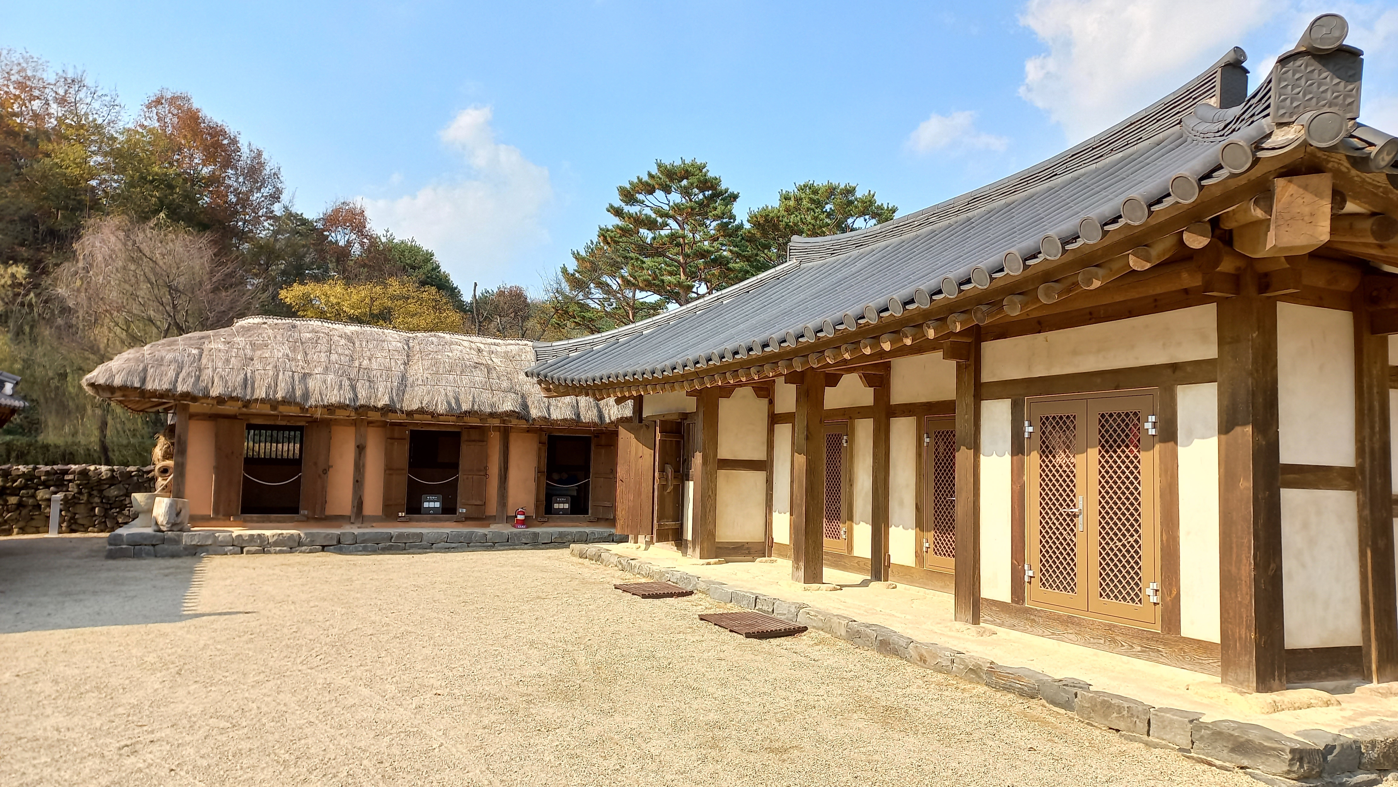 위에는 민가가 있는 초가지붕이 있고, 아래에는 양반가들이 사는 한옥마을 모습입니다.