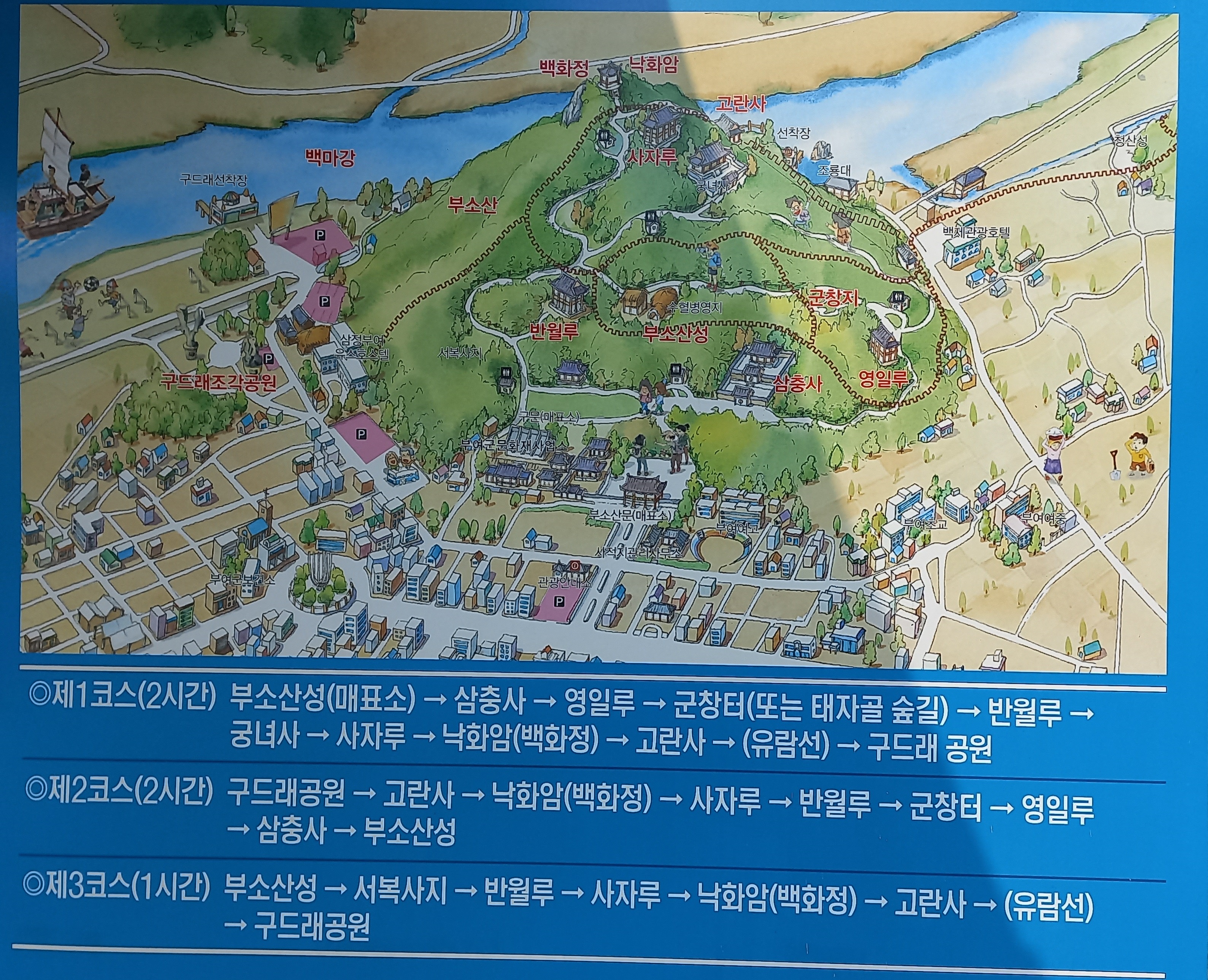 2코스(2시간) 구드래공원 - 백마강유람선 - 고란사 - 낙화암(백화정) - 사자루 - 반월루 - 군창터 - 영일루 - 삼충사 - 부소산성 매표소