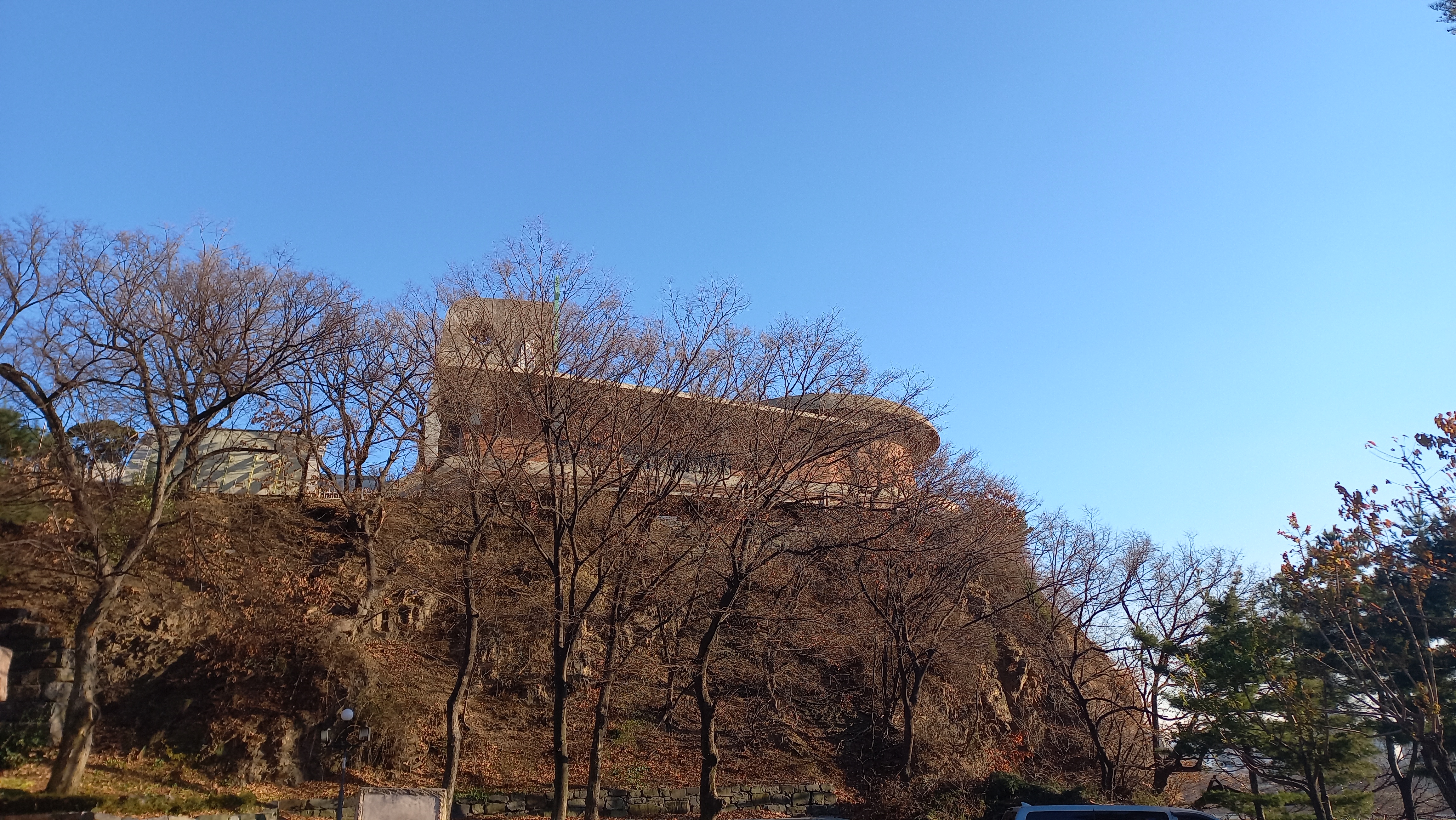 작은 산 위에 십자가가 있는 건물이죠.