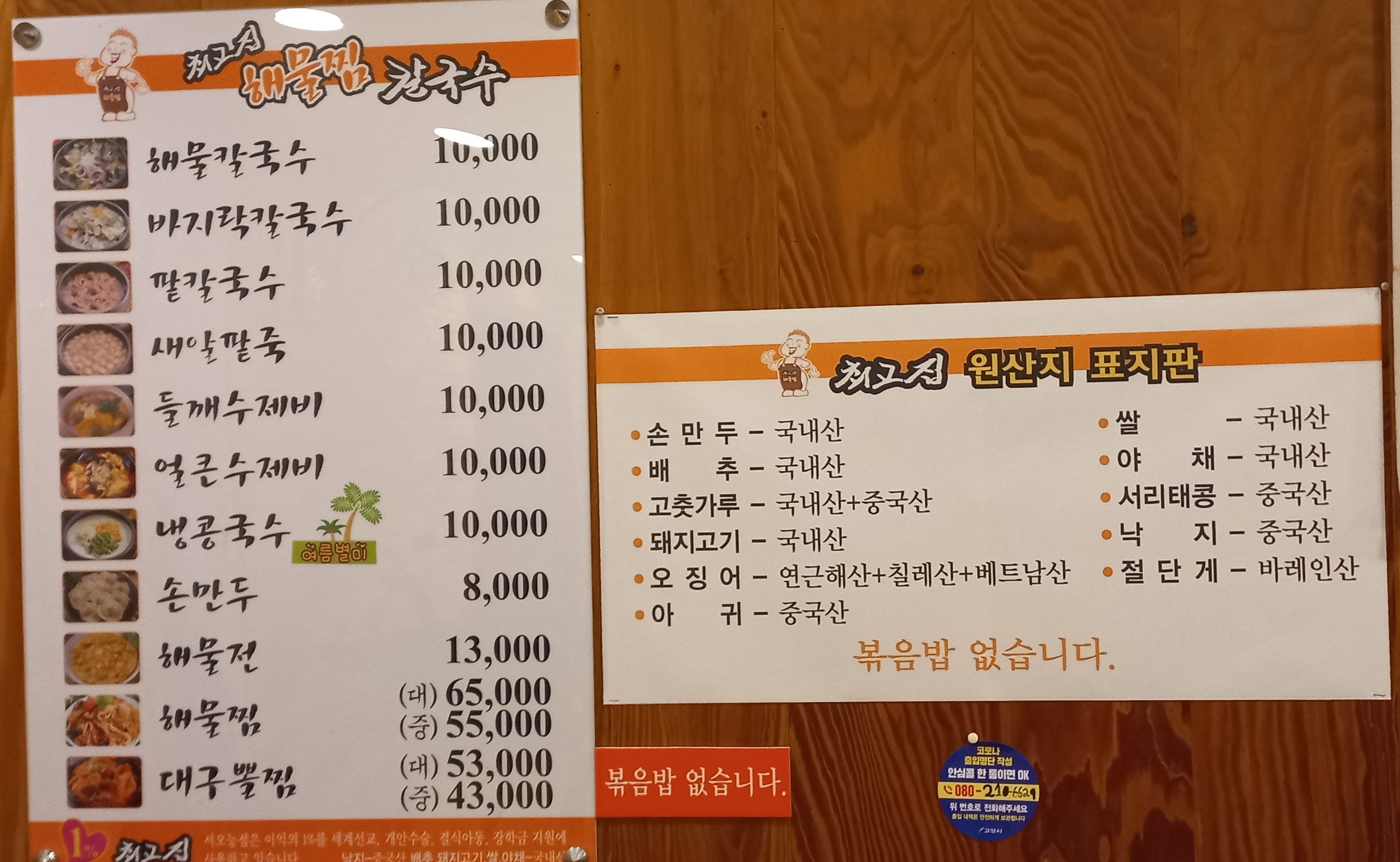 최고집 해물찜 칼국수 메뉴