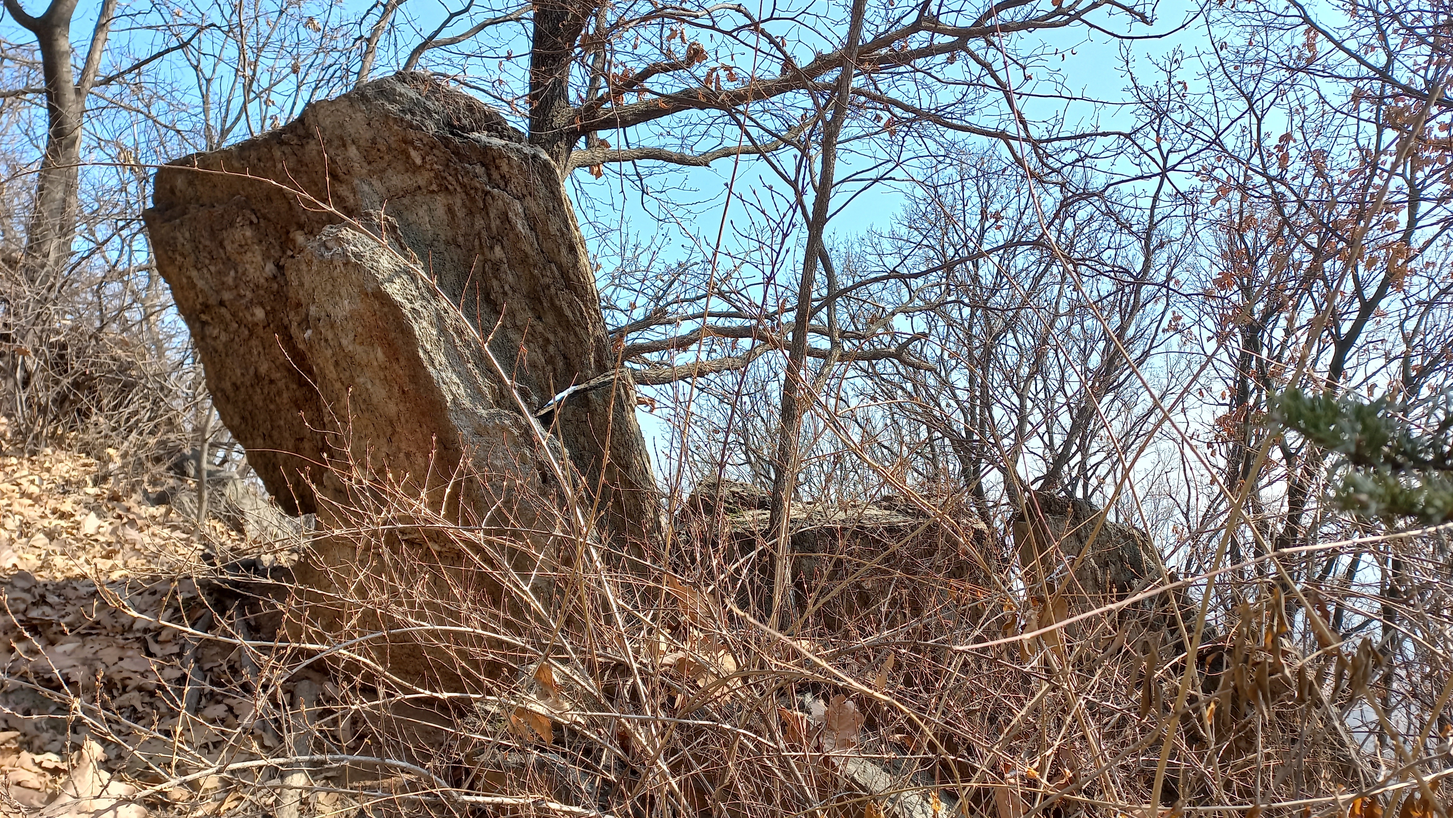 중간에 잘려있는 바위가 용케도 세워져 있어 신기합니다.