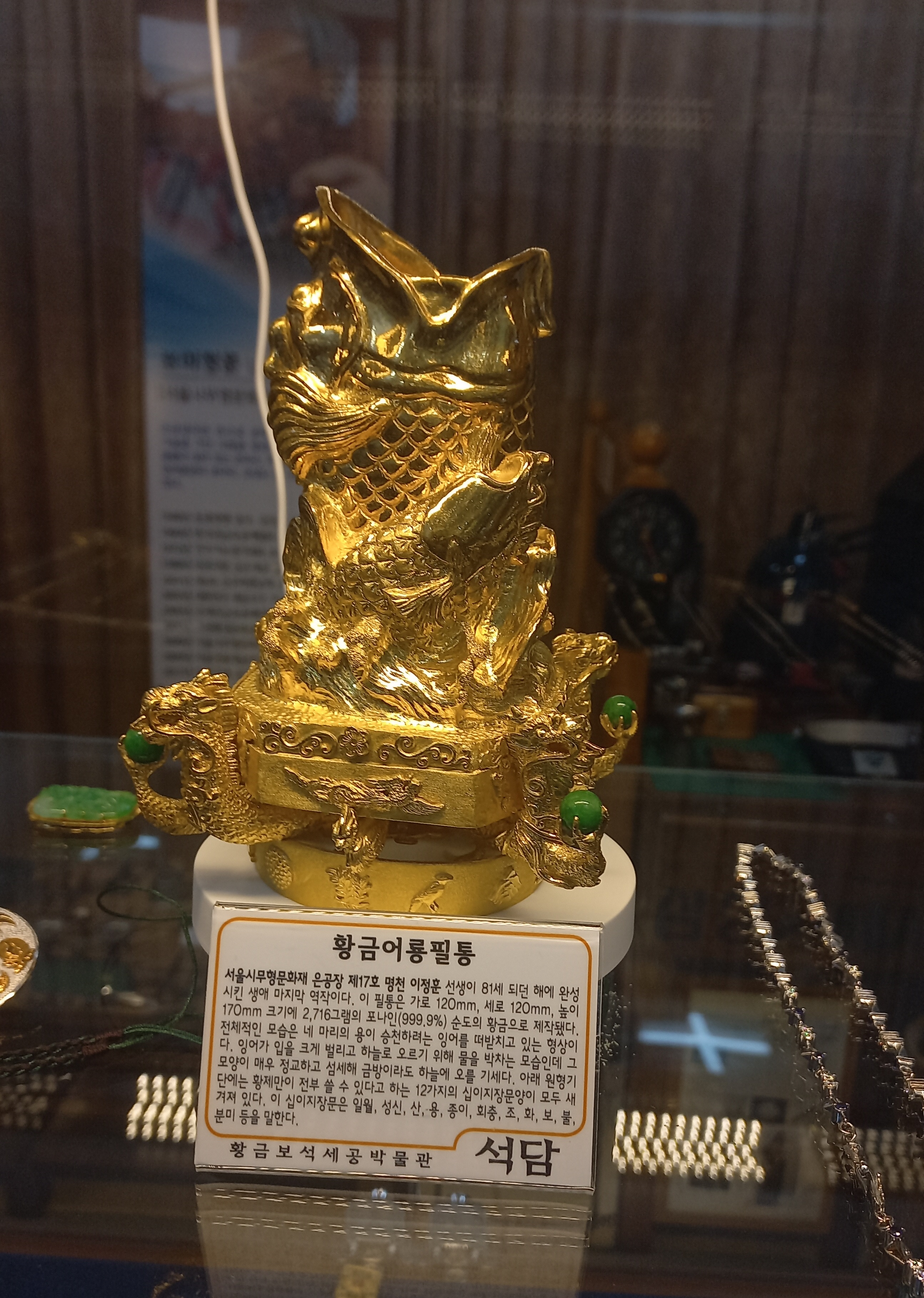 포나인 황금으로만 제작되었으며 4마리 용이 승천하려는 잉어를 떠받치고 있는 모습의 필통입니다.