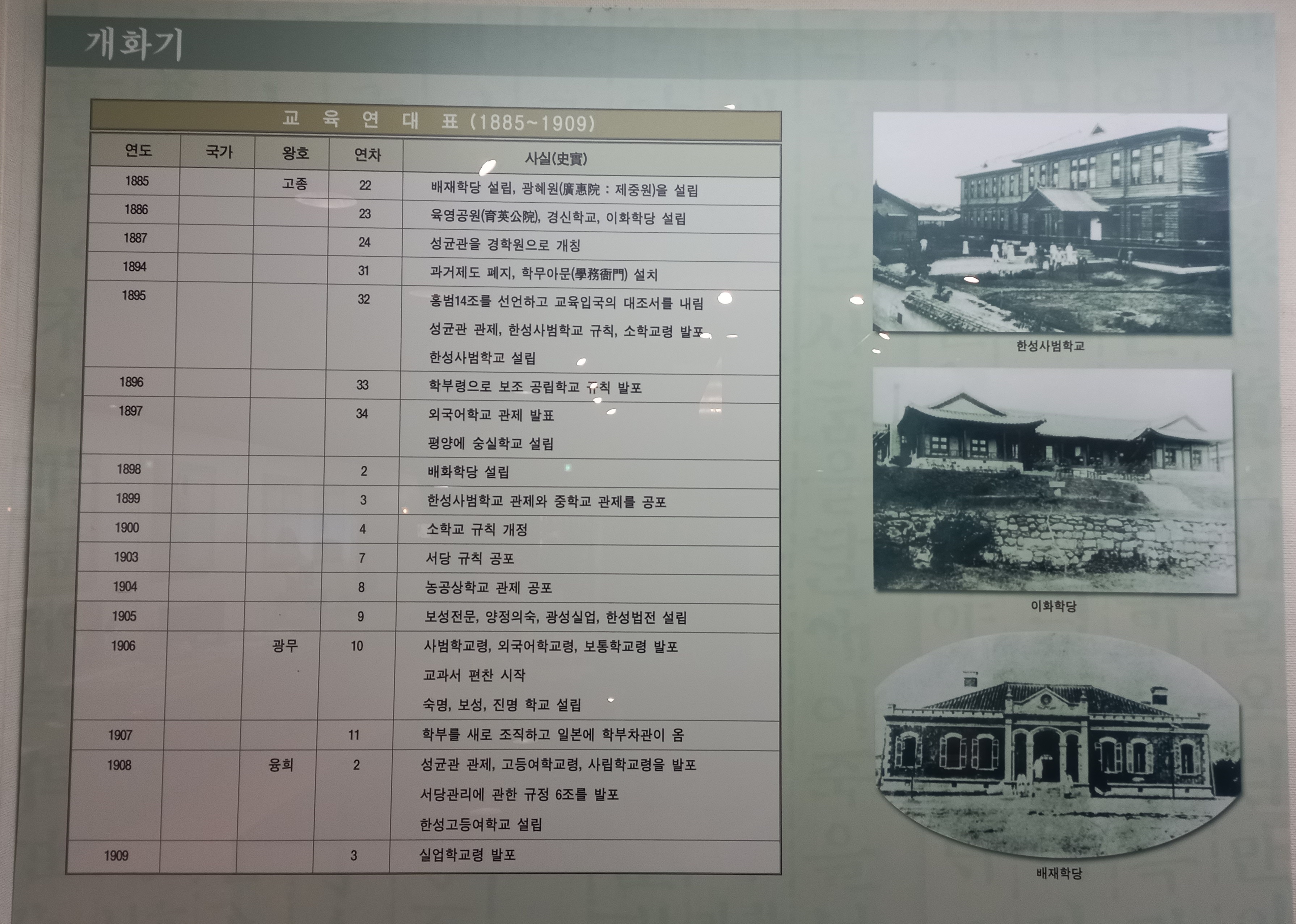 우리에게 익숙한 배재학당, 광혜원, 이화학당, 배화학당 등의 설립 연대가 보입니다.