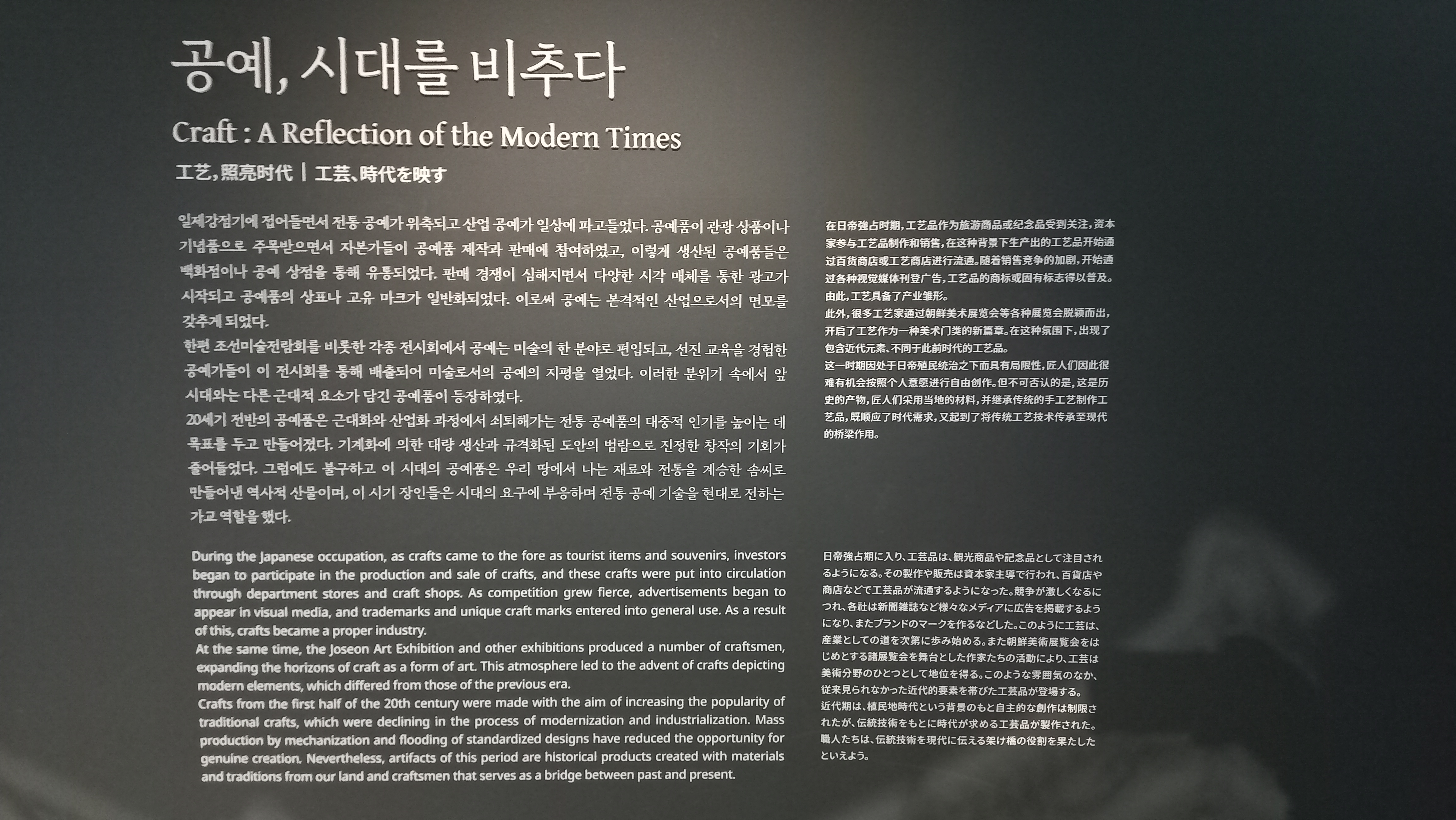 공예역사를 다루는 상설전시로 일부로 조선, 대한제국, 일제강점기의 공예와 장인의 이야기를 소개하고 있습니다.