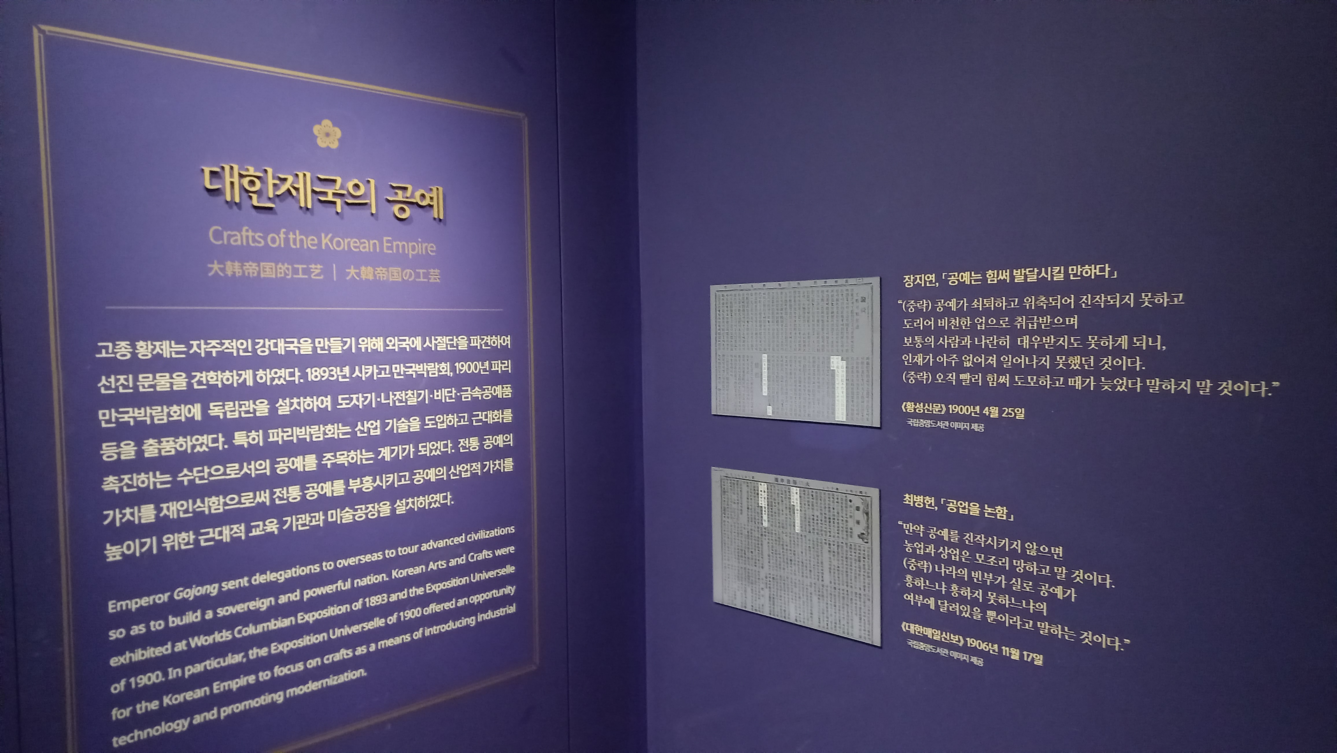 고종 황제는 자주적 강대국을 만들기 위해 1893년, 1900년에 만국박람회에 독립관을 설치하여 도자기, 나전칠기, 비단, 금속공예품 등을 출품했다고 합니다.