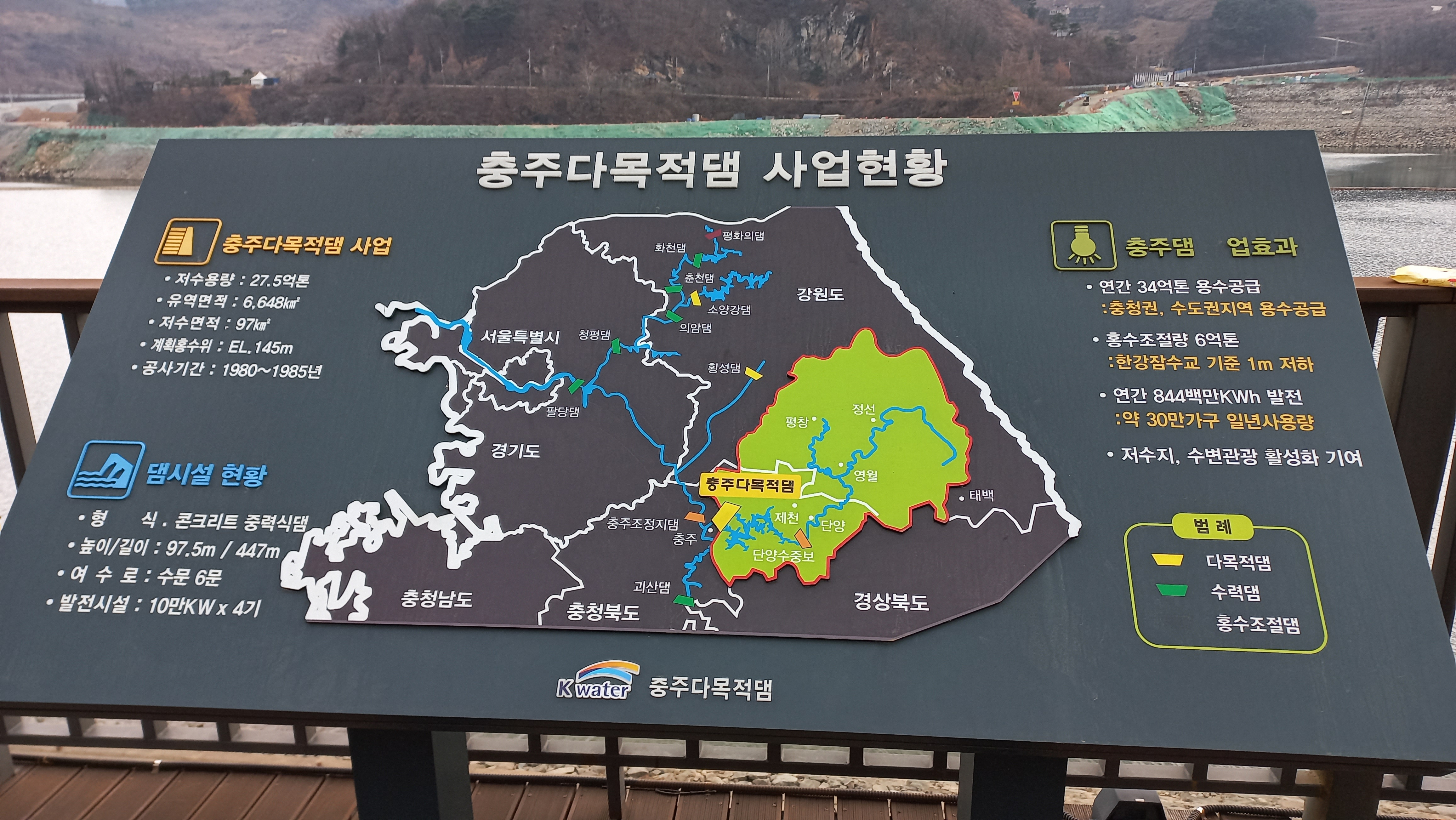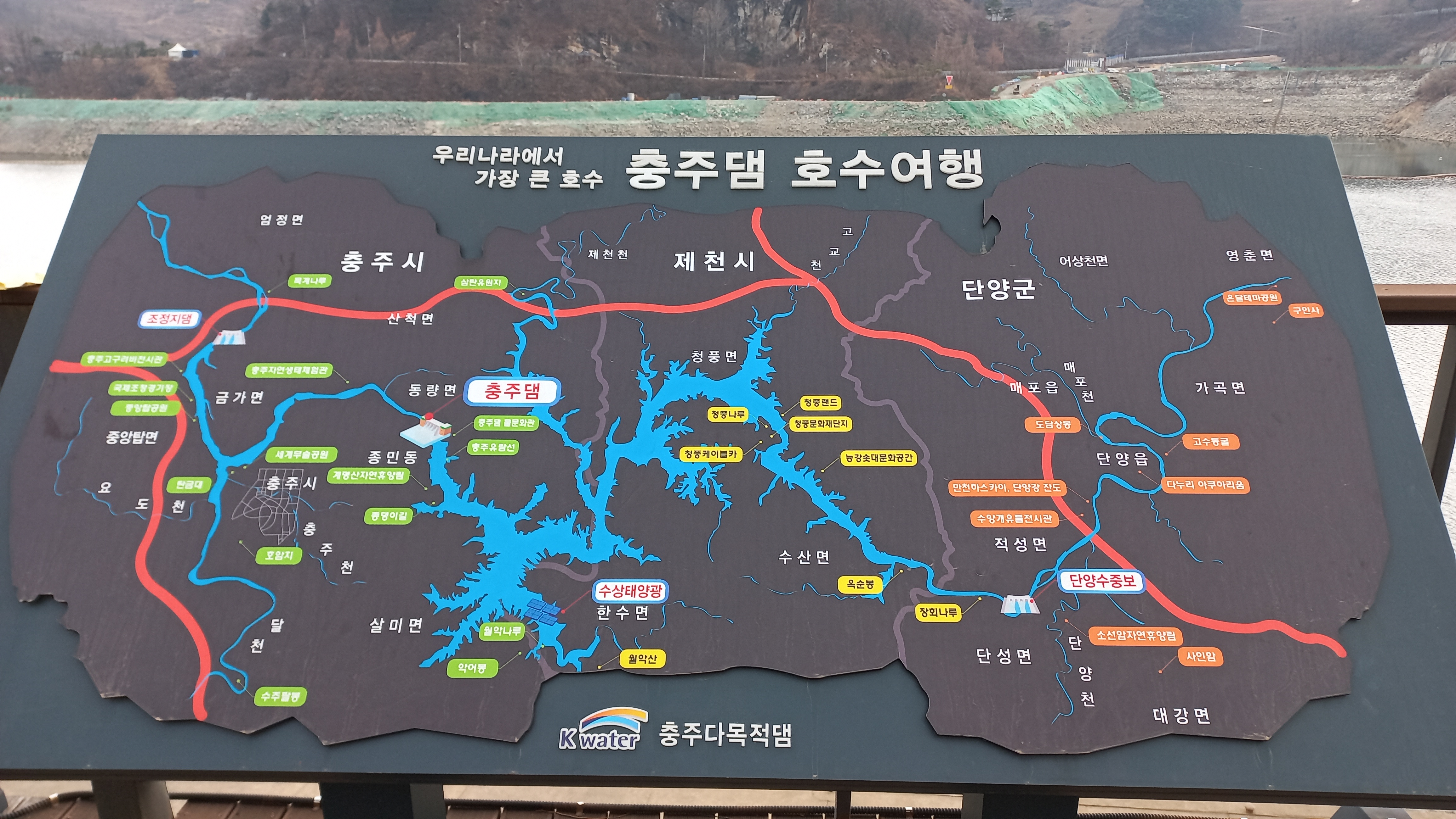 충주호는 면적 67.5㎢, 높이 97.5m, 길이 464m, 저수량 27억 5000t으로 충주댐 조성으로 만들어진 인공호수입니다.