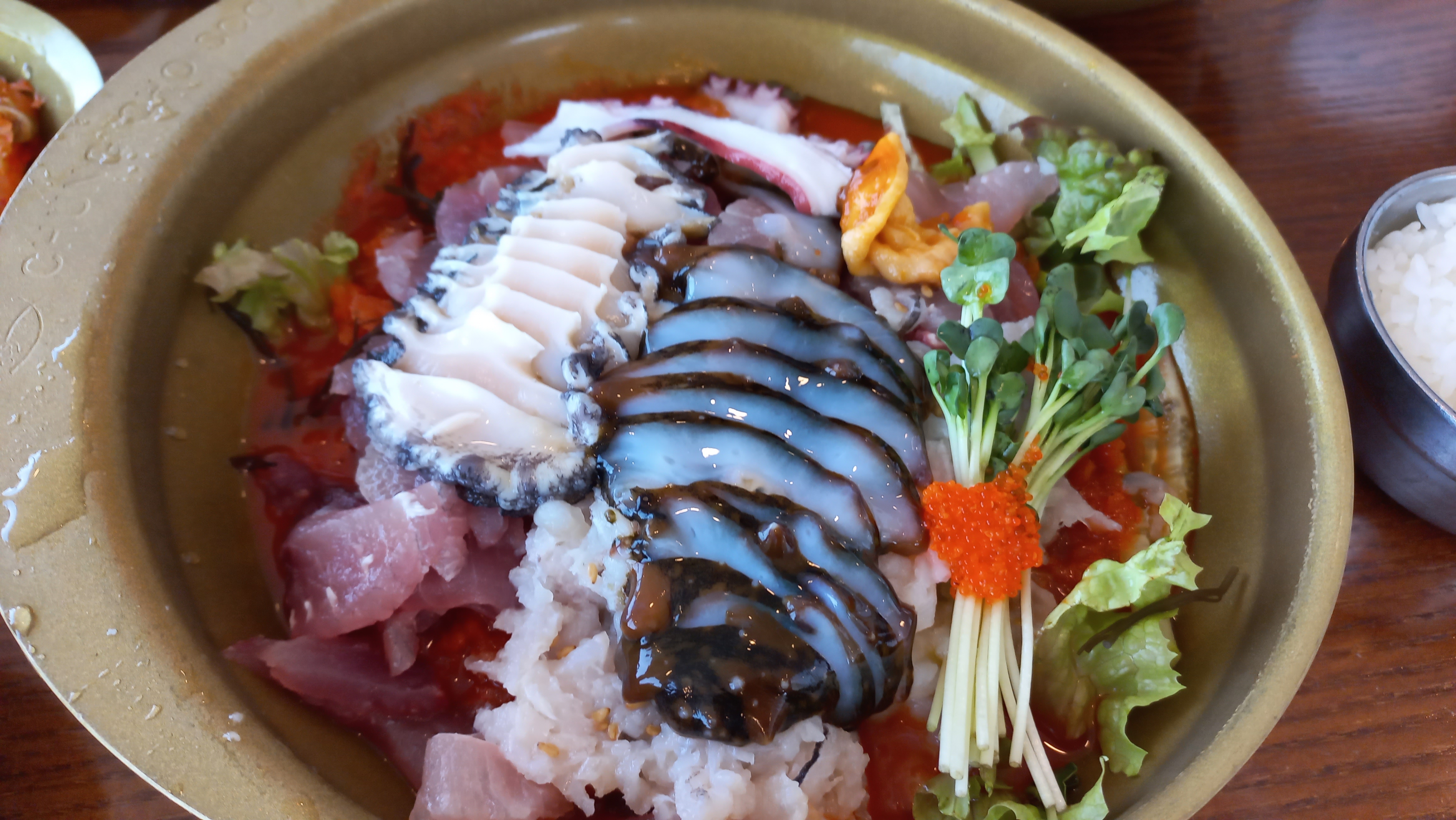 일반물회에 비해 전복과 해삼이 추가로 올라간 해전물회
