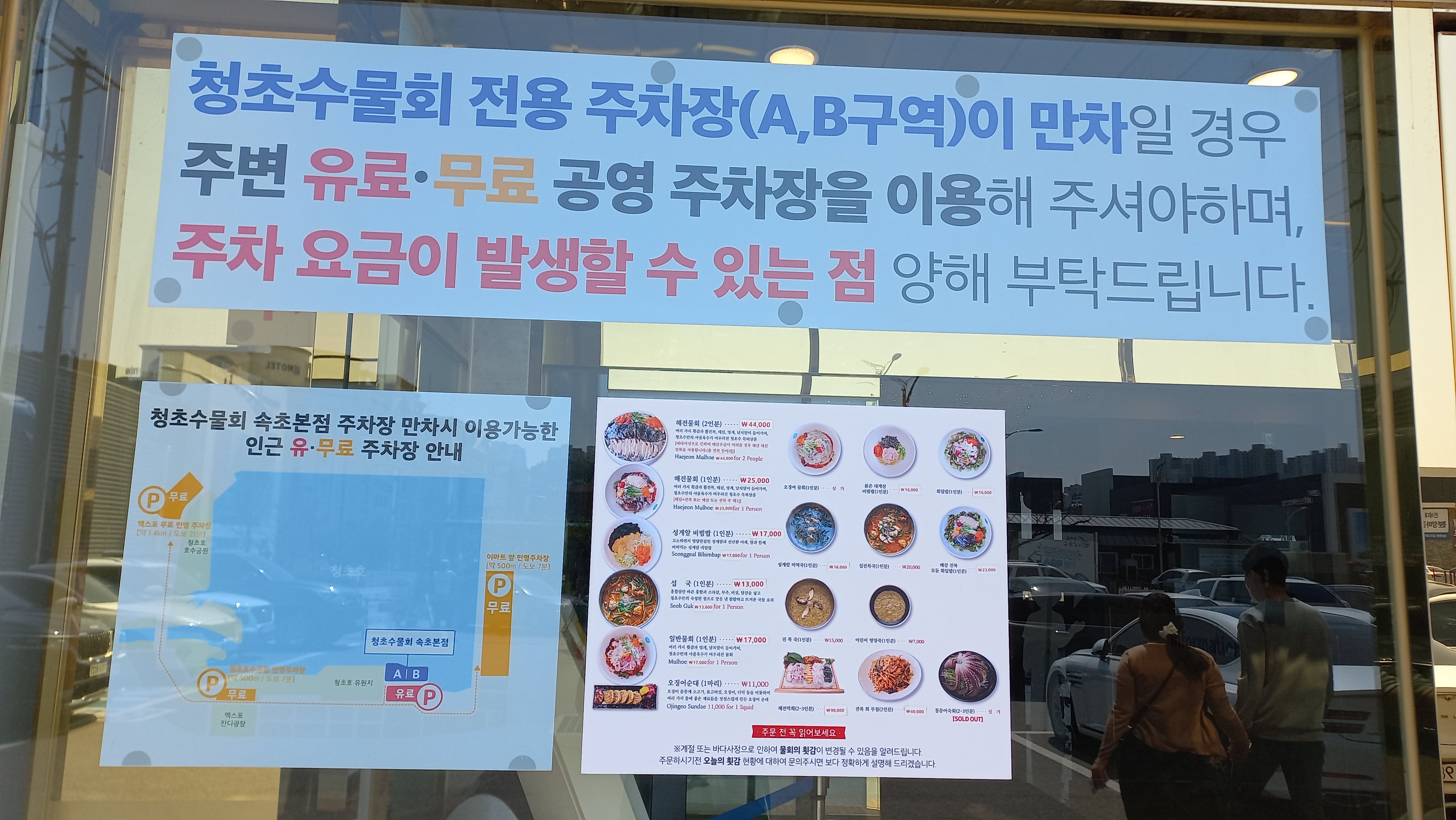 청초수 물회를 찾는 고객이 너무 많아 주차구역이 만차일 경우 주위 유료 혹은 무료주차장을 이용하라는 안내문구