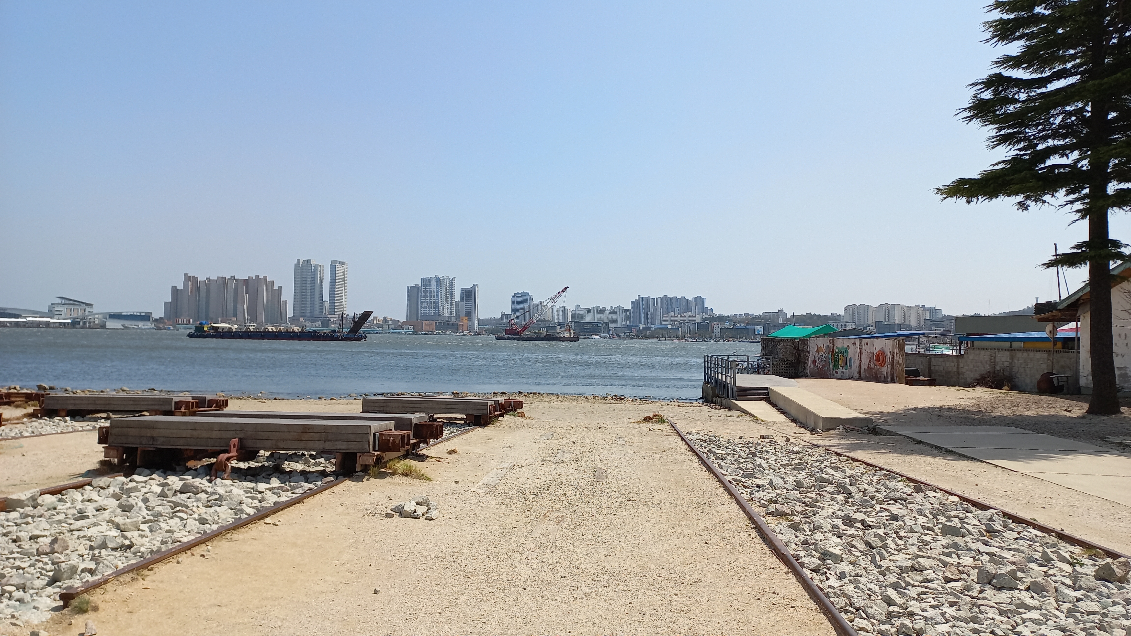 청초호를 바라보는 칠성조선소 앞마당에는 선박을 끌어올리던 레일과 장비들이 그대로 남아 있습니다.