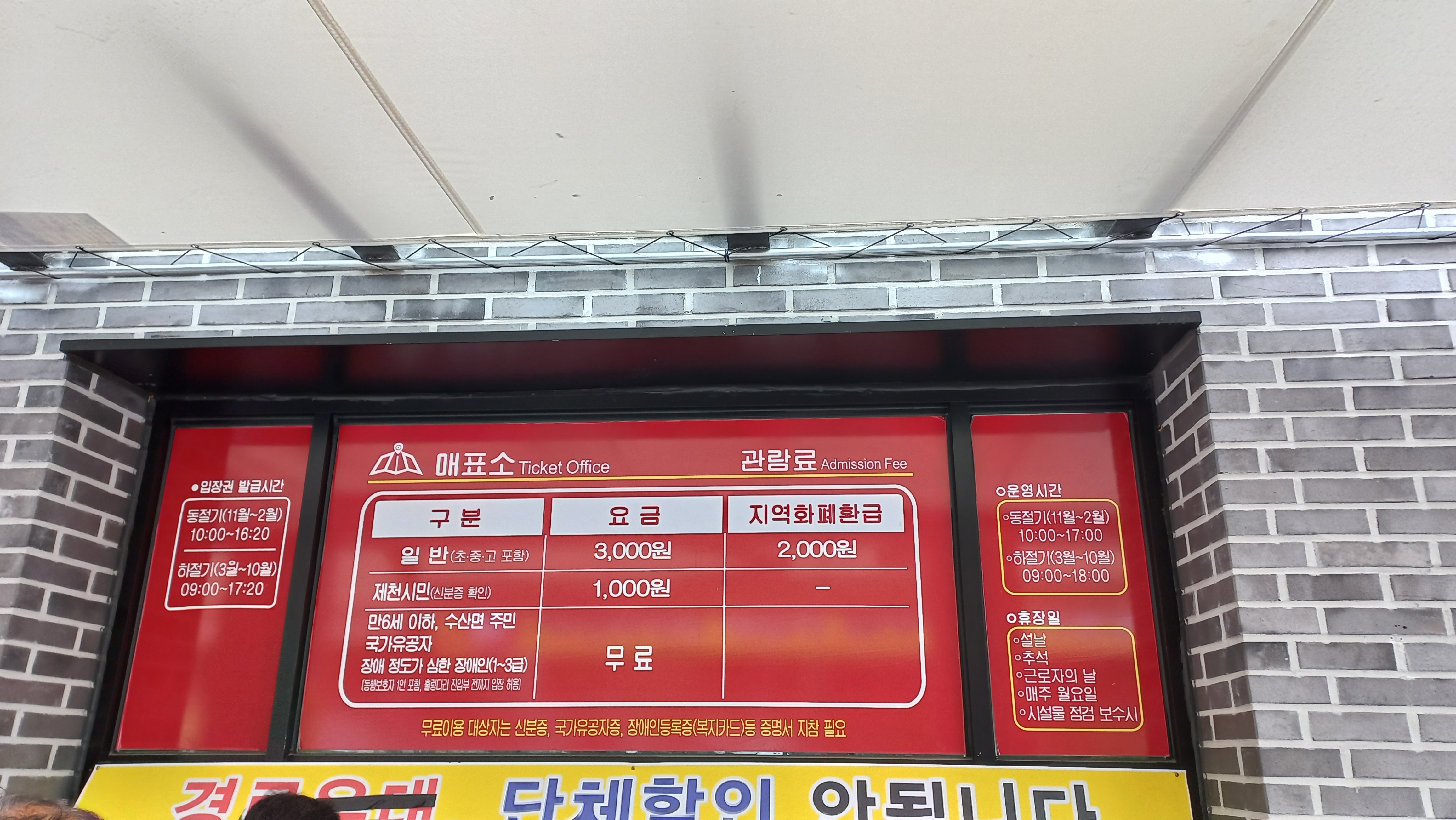 제천시민 1,000원, 7시 미만, 수산면민, 유공자, 장애인 1~3급은 무료