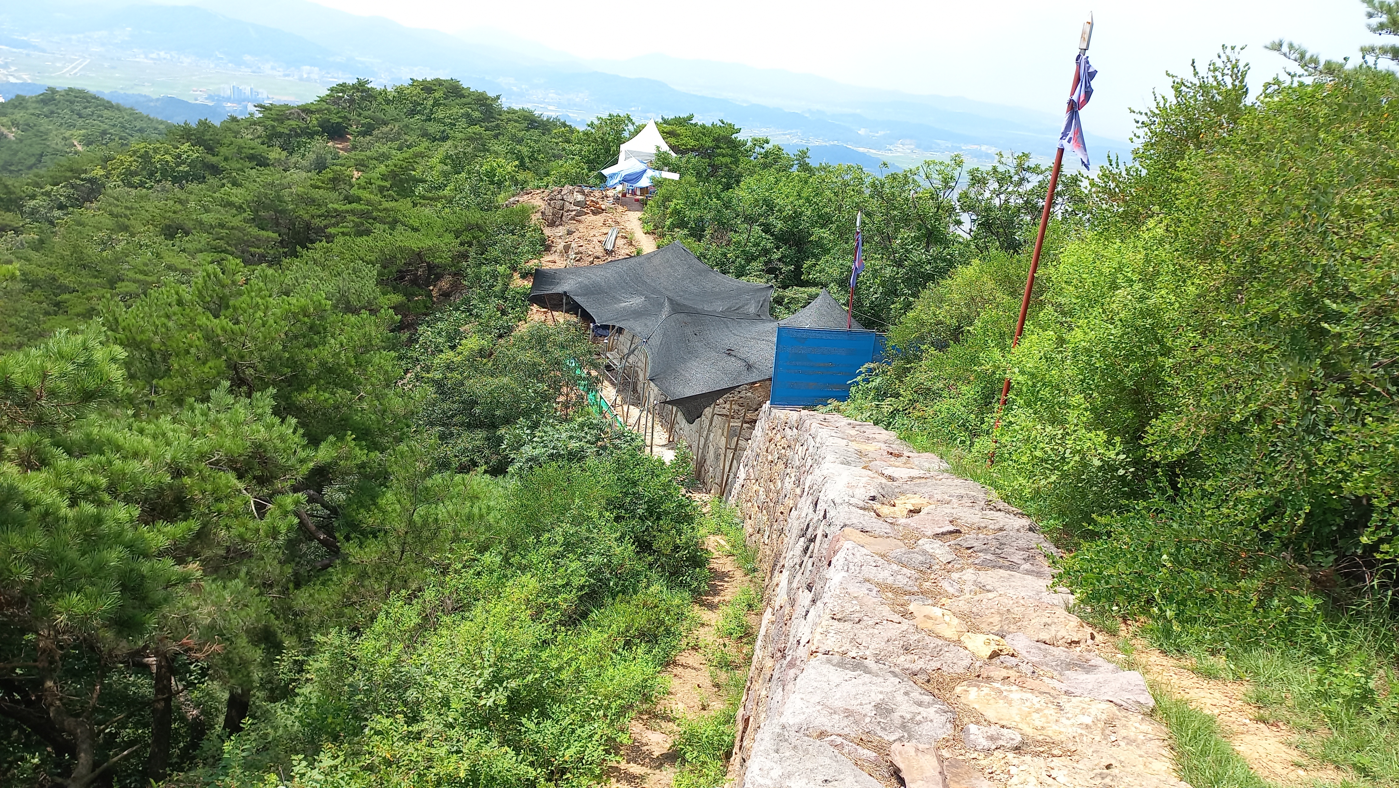 정상부에서 남문 방향으로는 암석을 사각형으로 다듬어 있고, 북문에서 정상부로는 깬돌을 이용하여 세운 성벽이 13단계까지 남아 있다고 합니다.