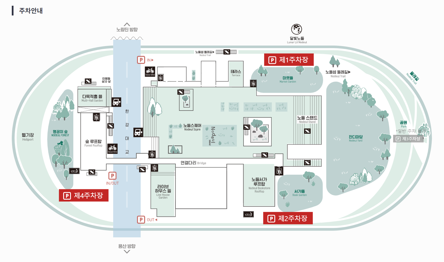 한강대교를 중심으로 동쪽에 4주차장이, 서쪽에 1주차장과 2주차장이 있습니다.