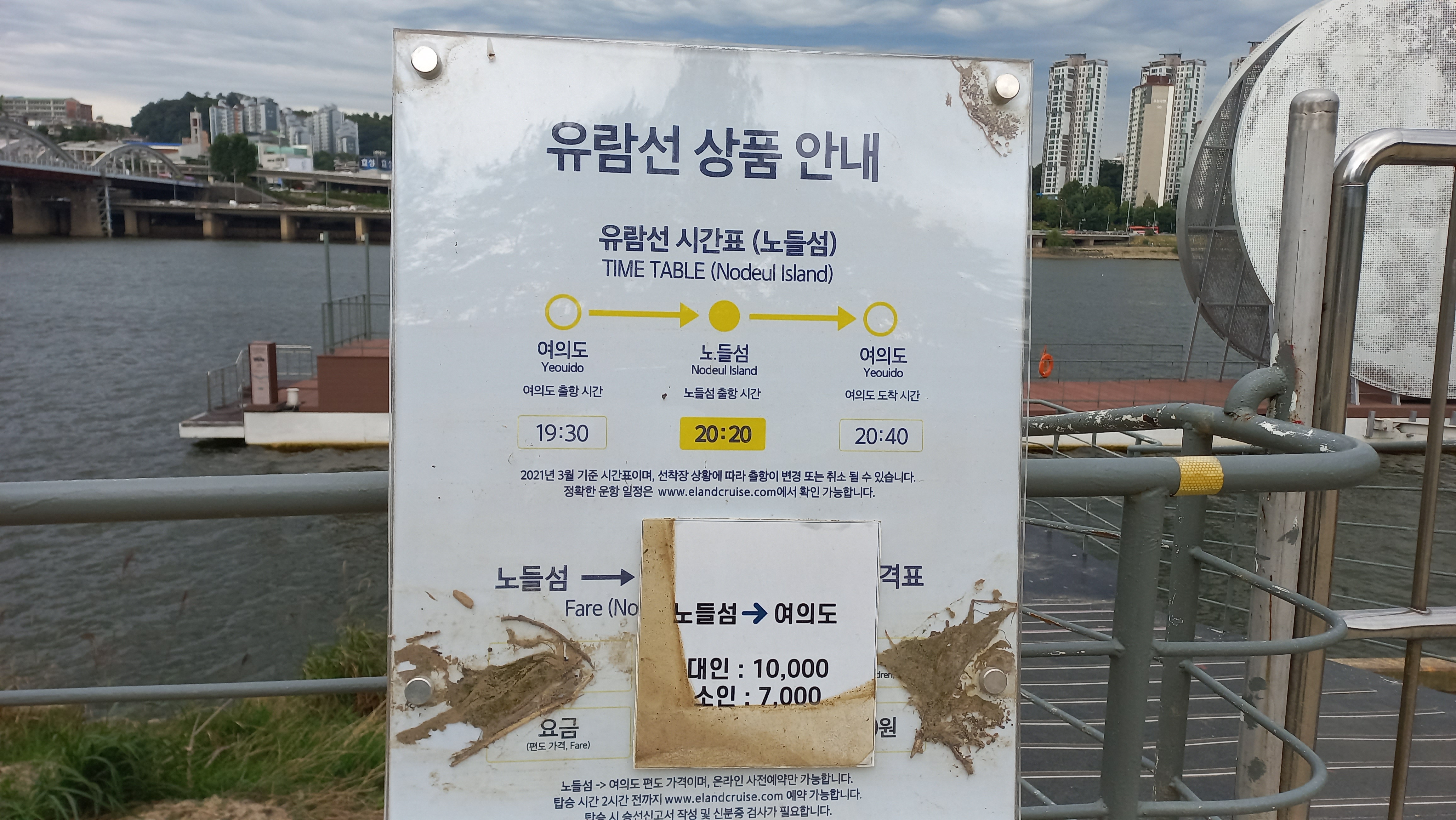 19:30에 여의도 한강공원에서 출발한 유람선은 노들섬에 20:20에 도착하여 다시 여의도에 20:40에 도착하는 코스입니다.