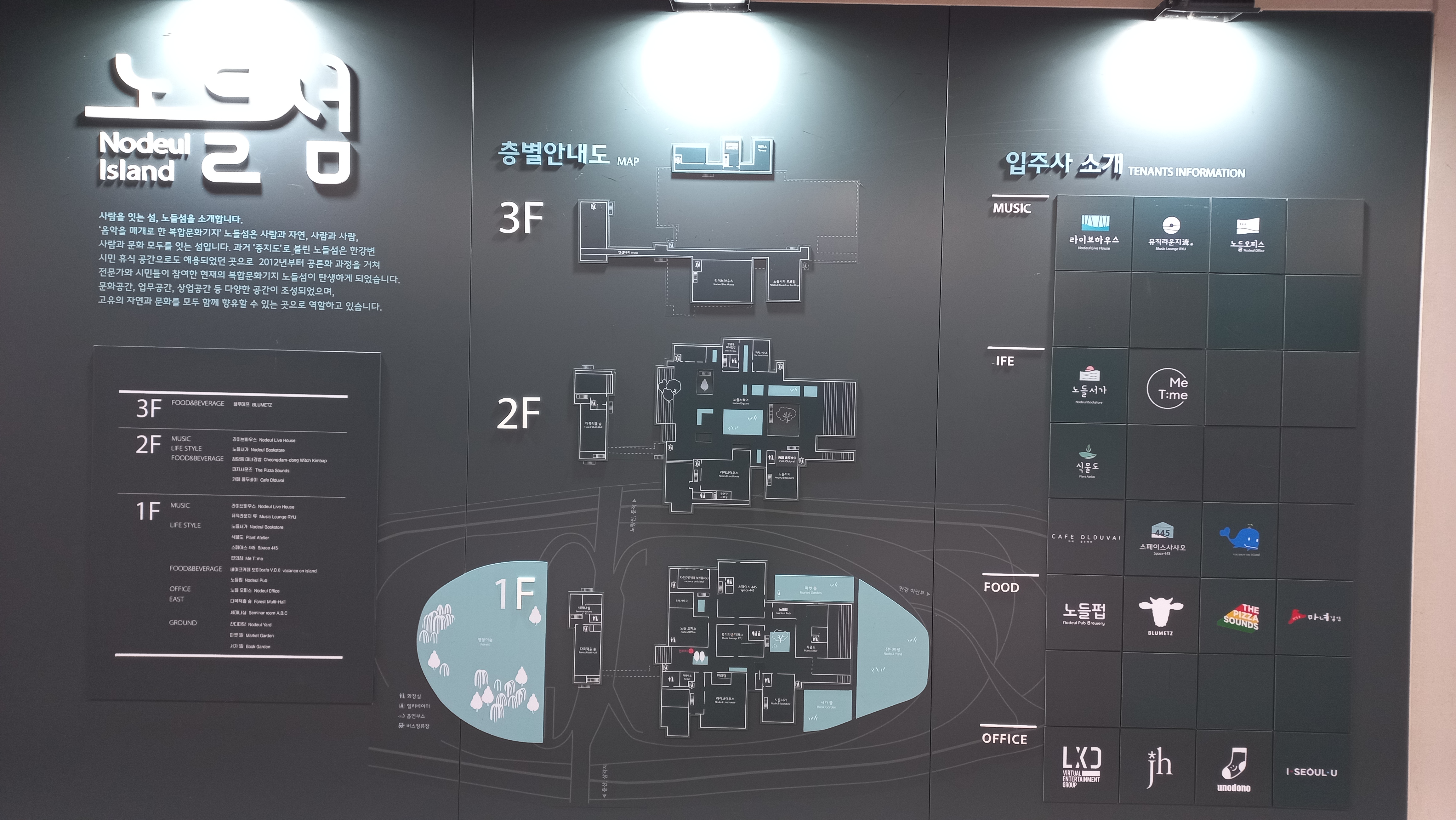 1층엔 라이브하우스, 리허설스튜디오, 다목적홀 숲, 뮤직라운지 류, 노들오피스, 노들서가, 스페이스445, 식물도, 바캉스온아일랜드 등