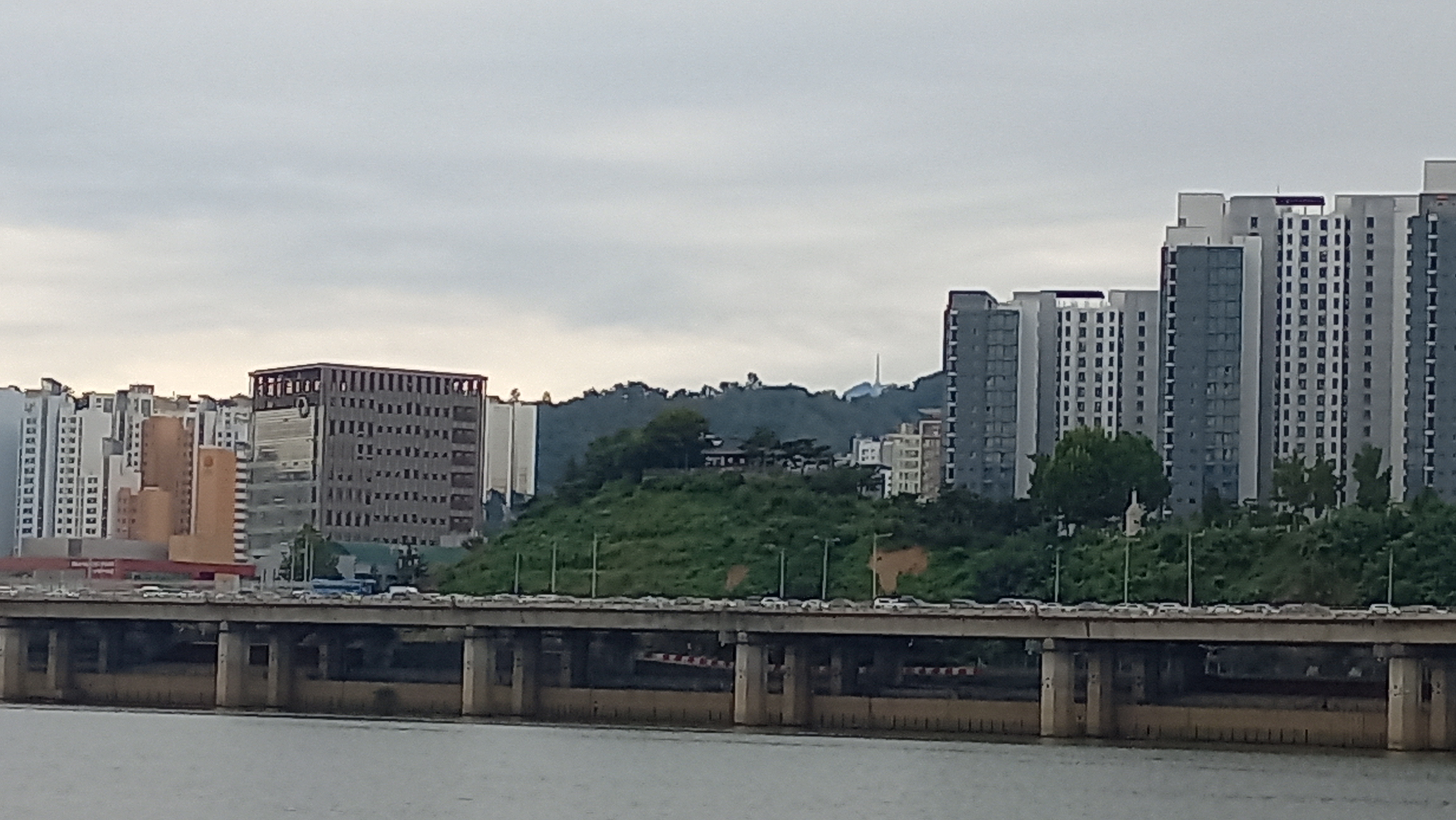 올림픽대로 노량대교와 흑석동 아파트 단지 사이로 보이는 효사정