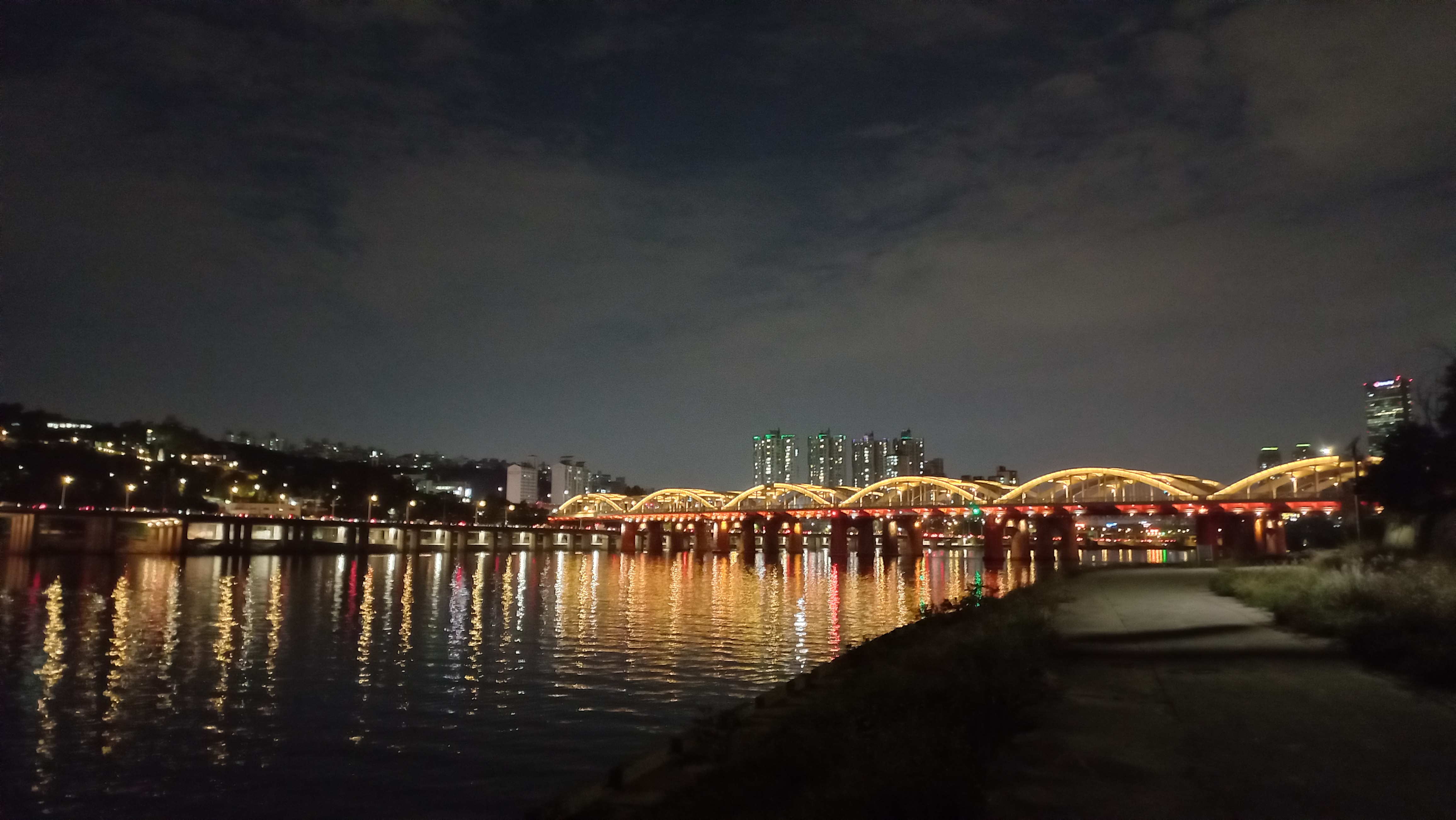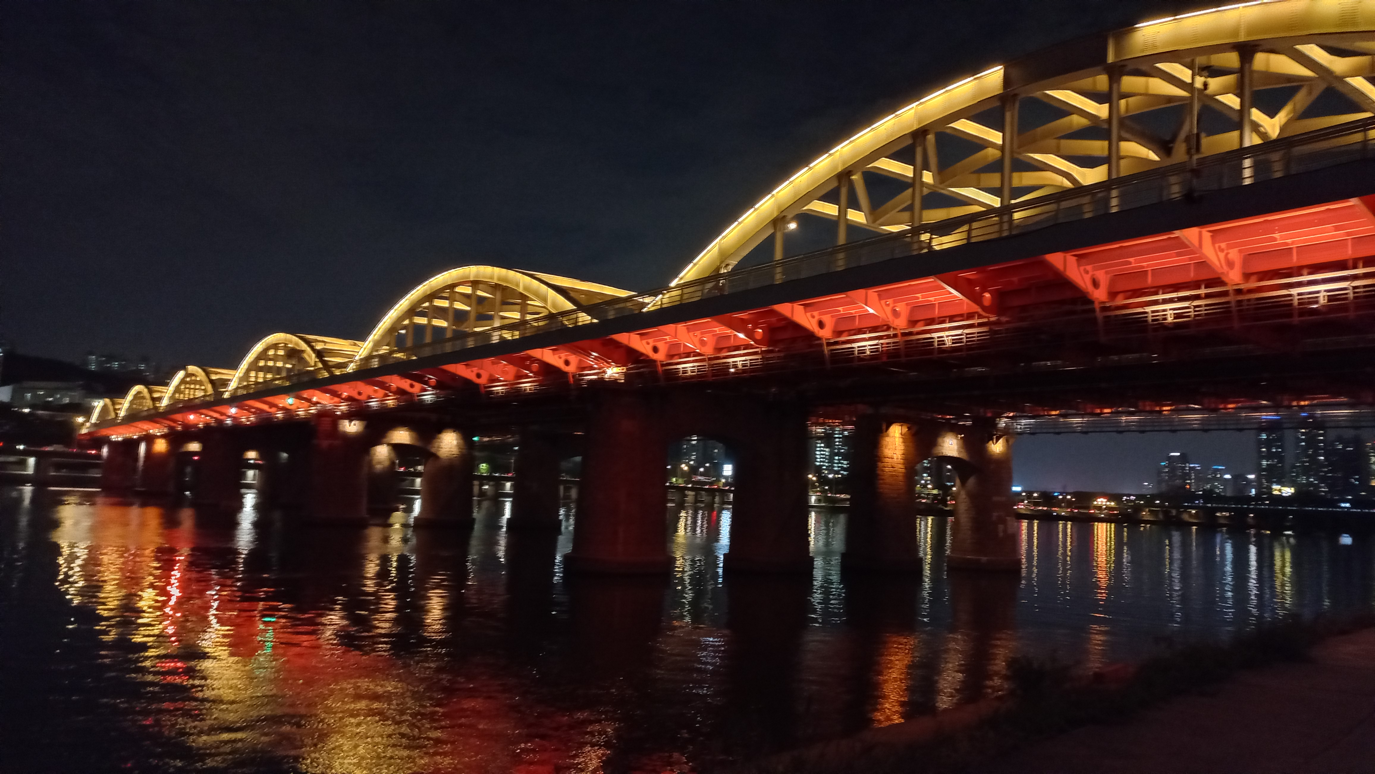 한강대교 중간, 노들섬 육교에서 바라본 한강대교 북단인 용산구 방향 야경이고요.