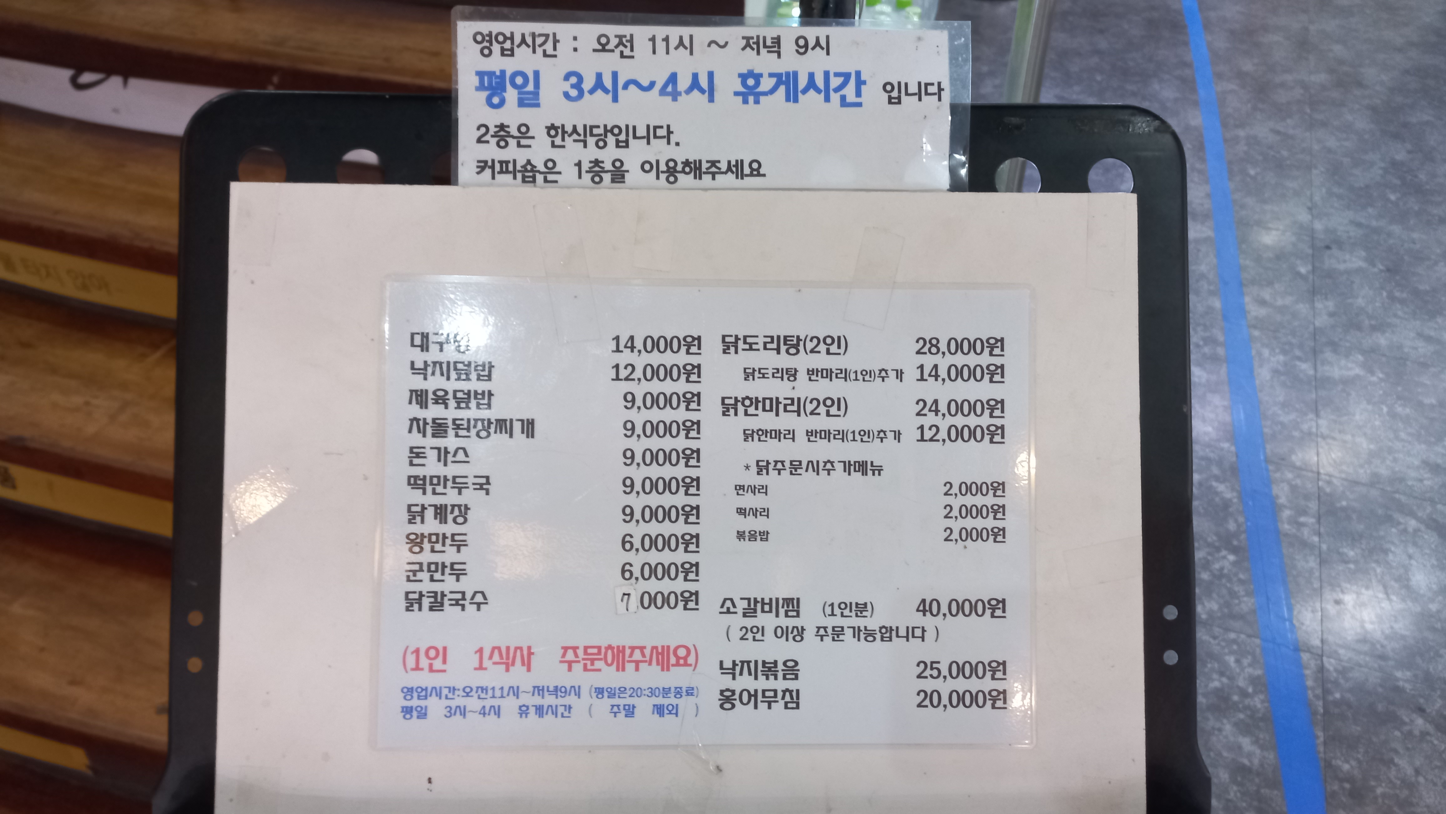 대구탕과 낙지덮밥, 제육덮밥, 차돌된장찌개, 돈가스, 떡만두국, 닭계장 등의 메뉴가 있습니다.