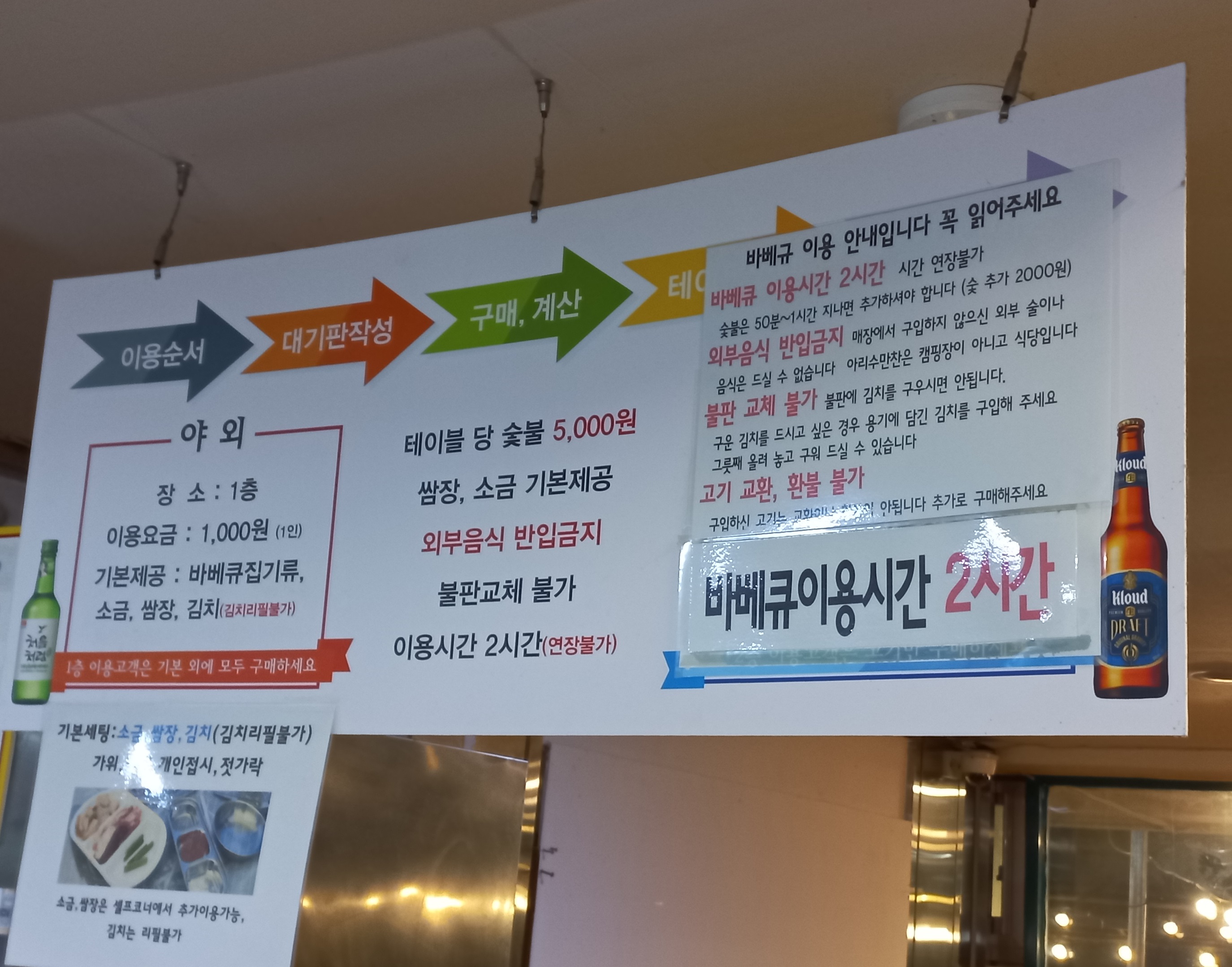순서가 되어 바베큐 이용이 가능하면 편의점에 있는 고기와 야채 등 장을 직접보고 계산 후 지정된 테이블로 이동하는 시스템으로 운영 중입니다.