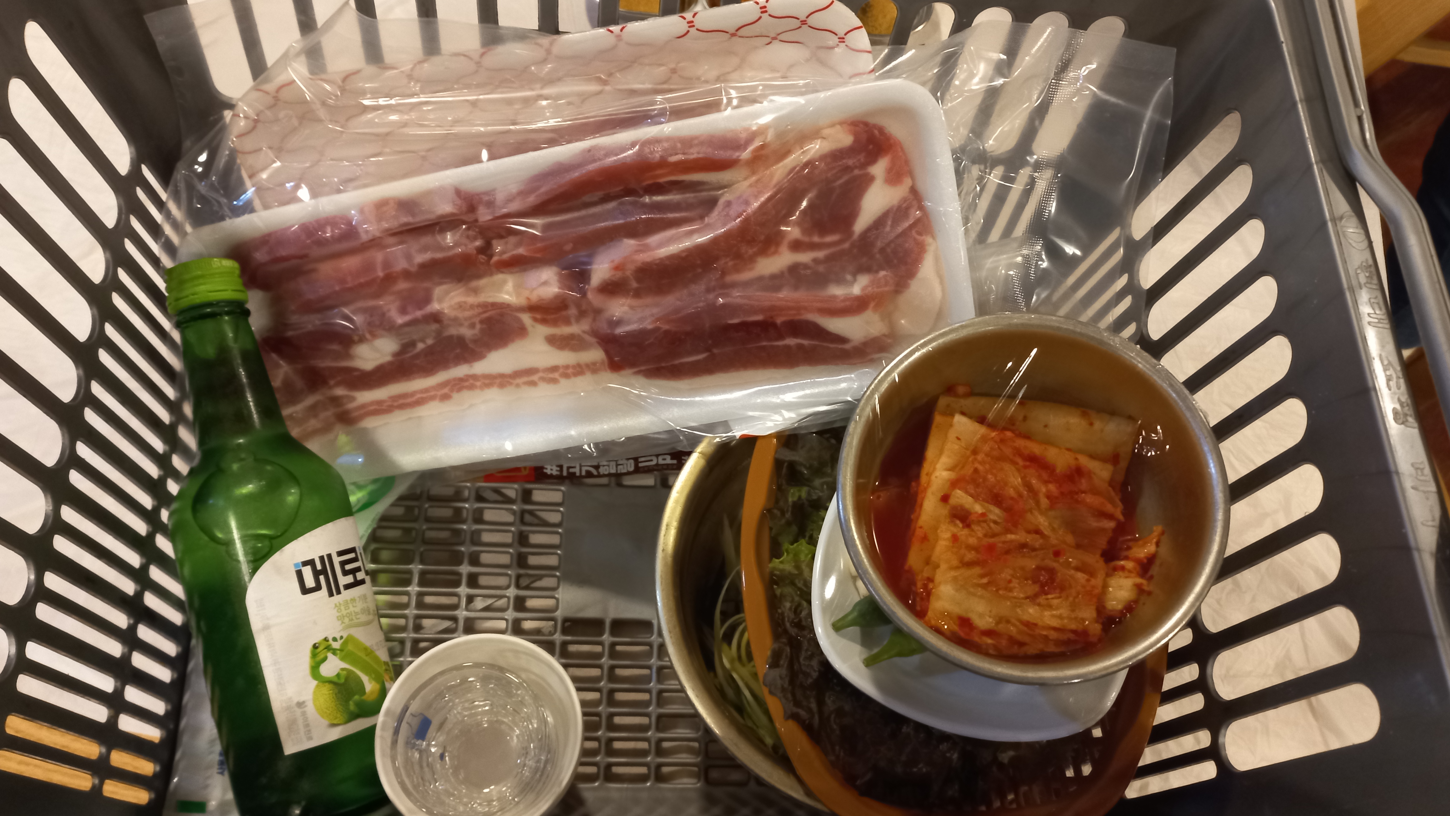 편의점에서 사 온 고기와 김치, 소주 하나, 파절임, 상추 등