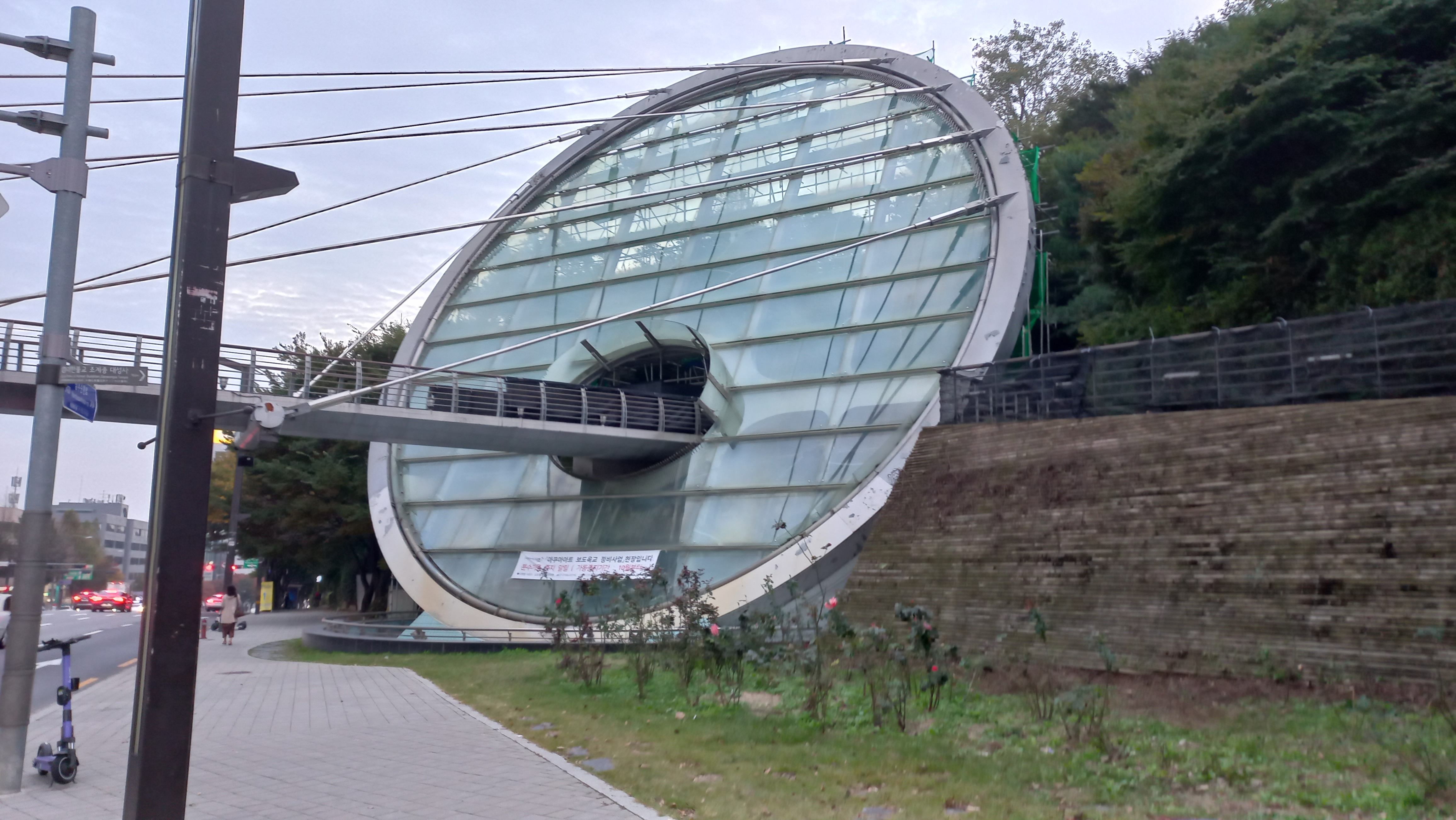 아쿠아아트 육교의 동그란 원형 조형물에서 물이 쏱아지면 무척 멋진 모습인데 아쉽습니다.