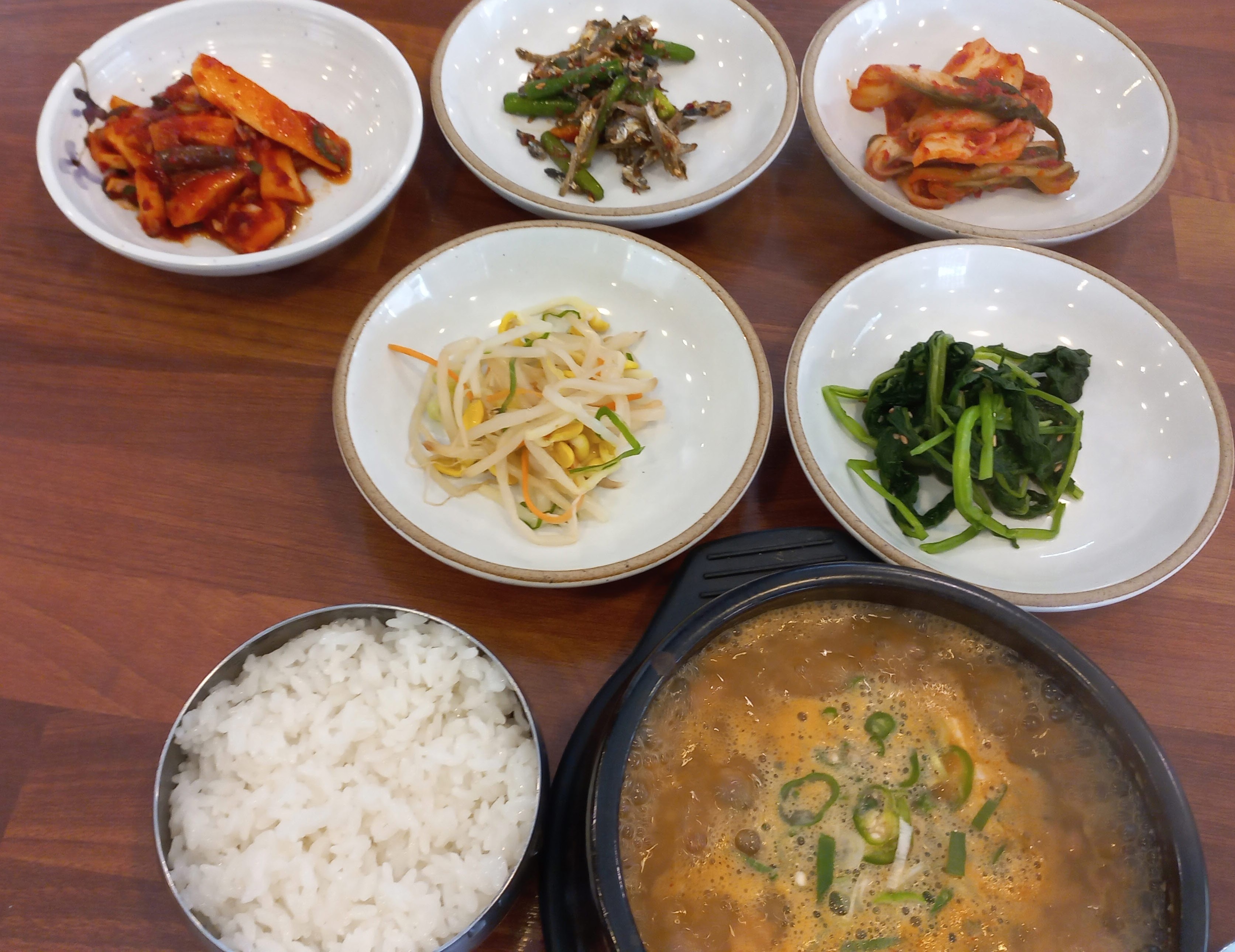솥밥을 추가하지 않고 청국장을 주문했는데, 5가지 반찬과 청국장이 곧바로 나왔습니다.