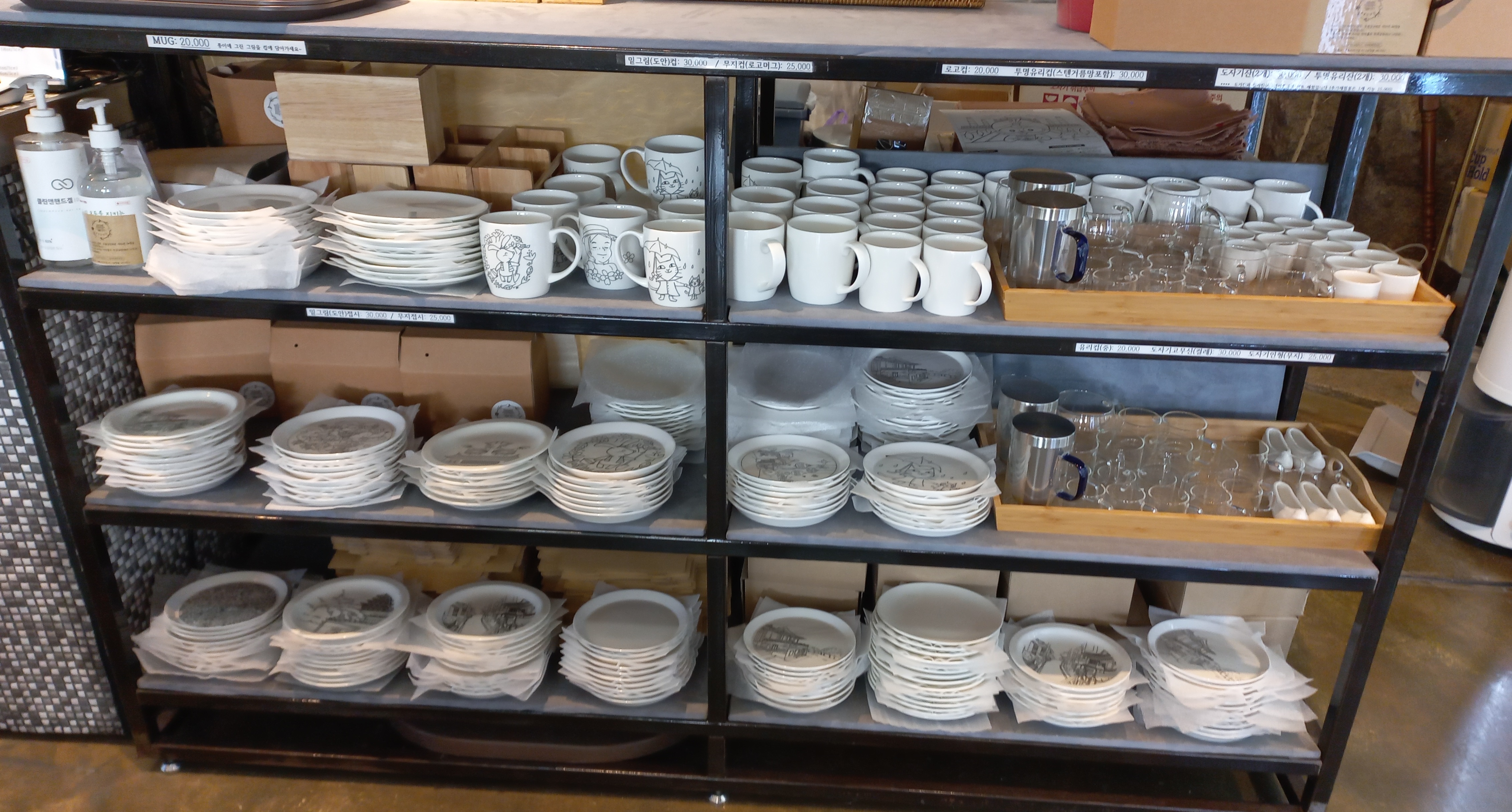 도자기 인형과 화분 3만원, 접시류는 25,000~30,000원, 로고 머그컵 25,000원, 고무신과 로고잔(2개)는 3만원, 로고컵과 머그컵은 2만원입니다.