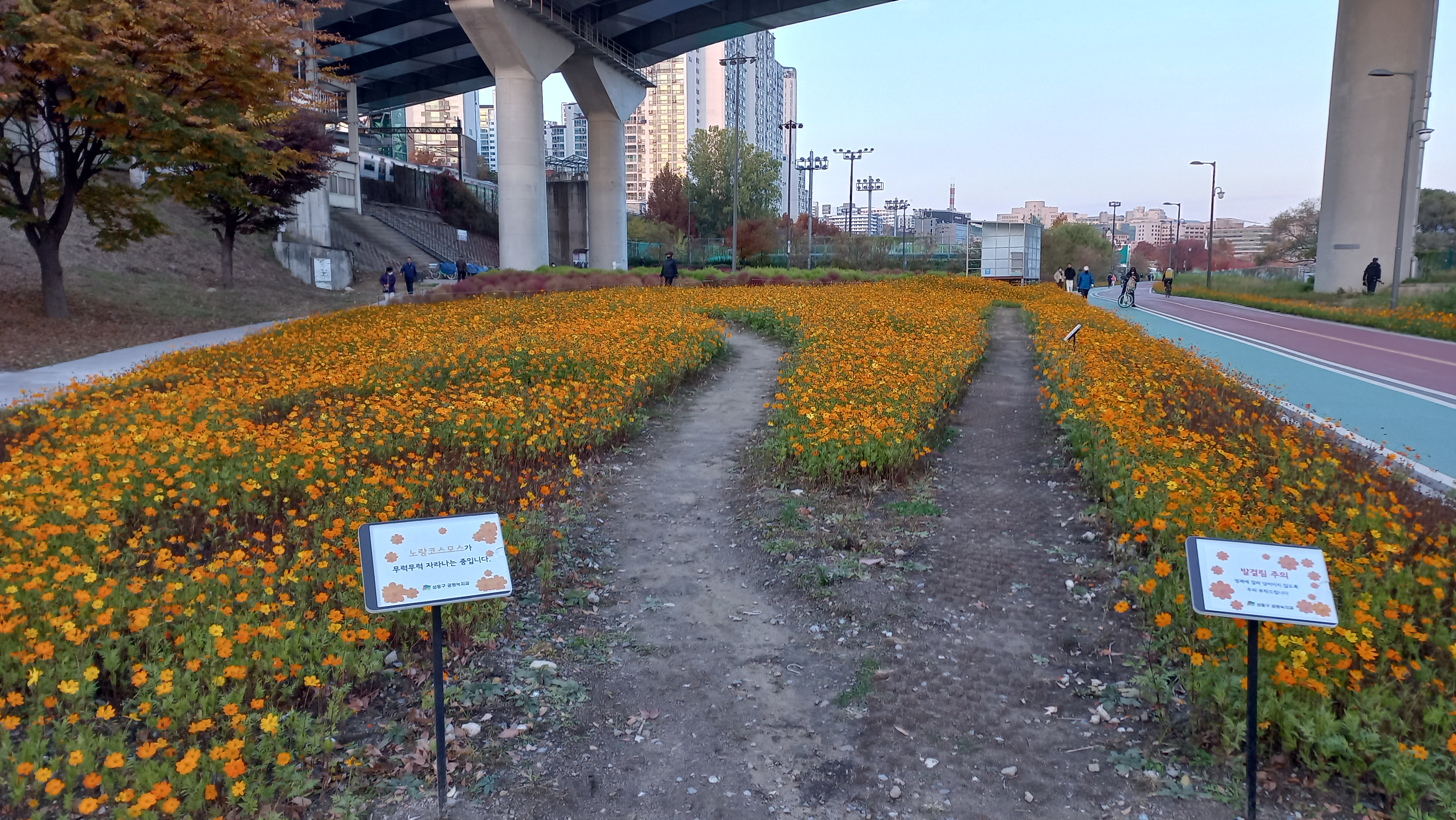 응봉산역 앞엔 노랑 코스모스가 지나가는 가을을 아쉬워하듯 명롱한 색감을 내고 있습니다.