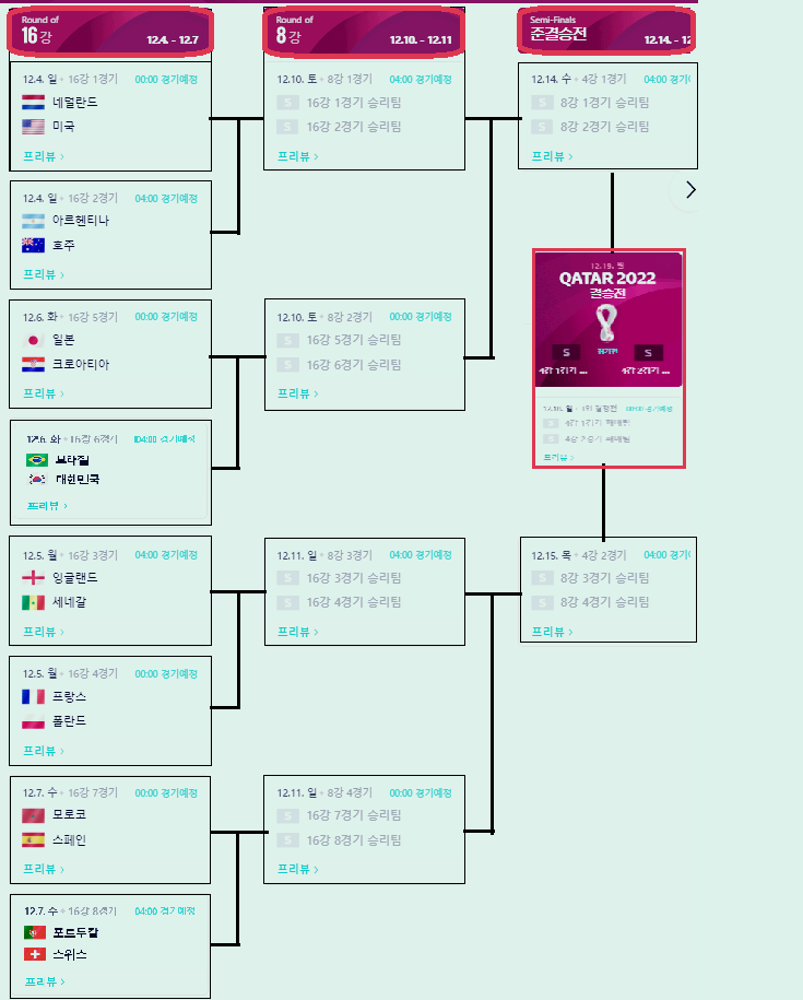 마지막으로 카타르 월드컵 16강 대진표입니다.