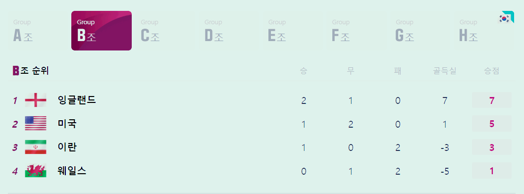 B조의 피파랭킹은 잉글랜드(5위), 미국(16위), 웨일스(19위), 이란(20위)입니다.