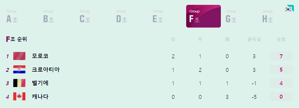 F조의 피파랭킹은 벨기에(2위), 크로아티아(12위), 모로코(22위), 캐나다(41위)입니다.