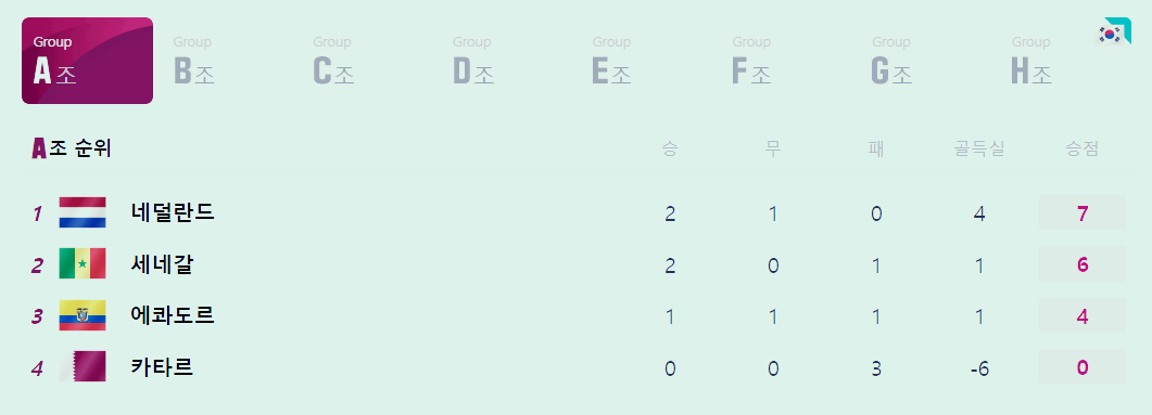 A조의 피파랭킹은 네덜란드(8위), 세네갈(18위), 에콰도르(44위), 카타르(50위)입니다.