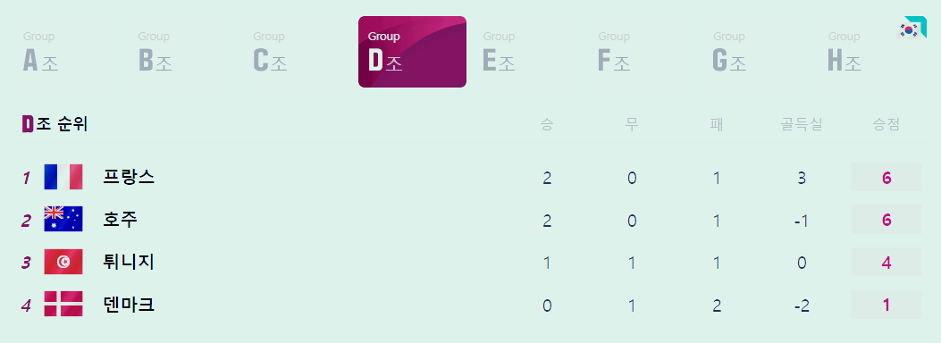 D조의 피파랭킹은 프랑스(4위), 덴마크(10위), 튀니지(30위), 호주(38위)입니다.