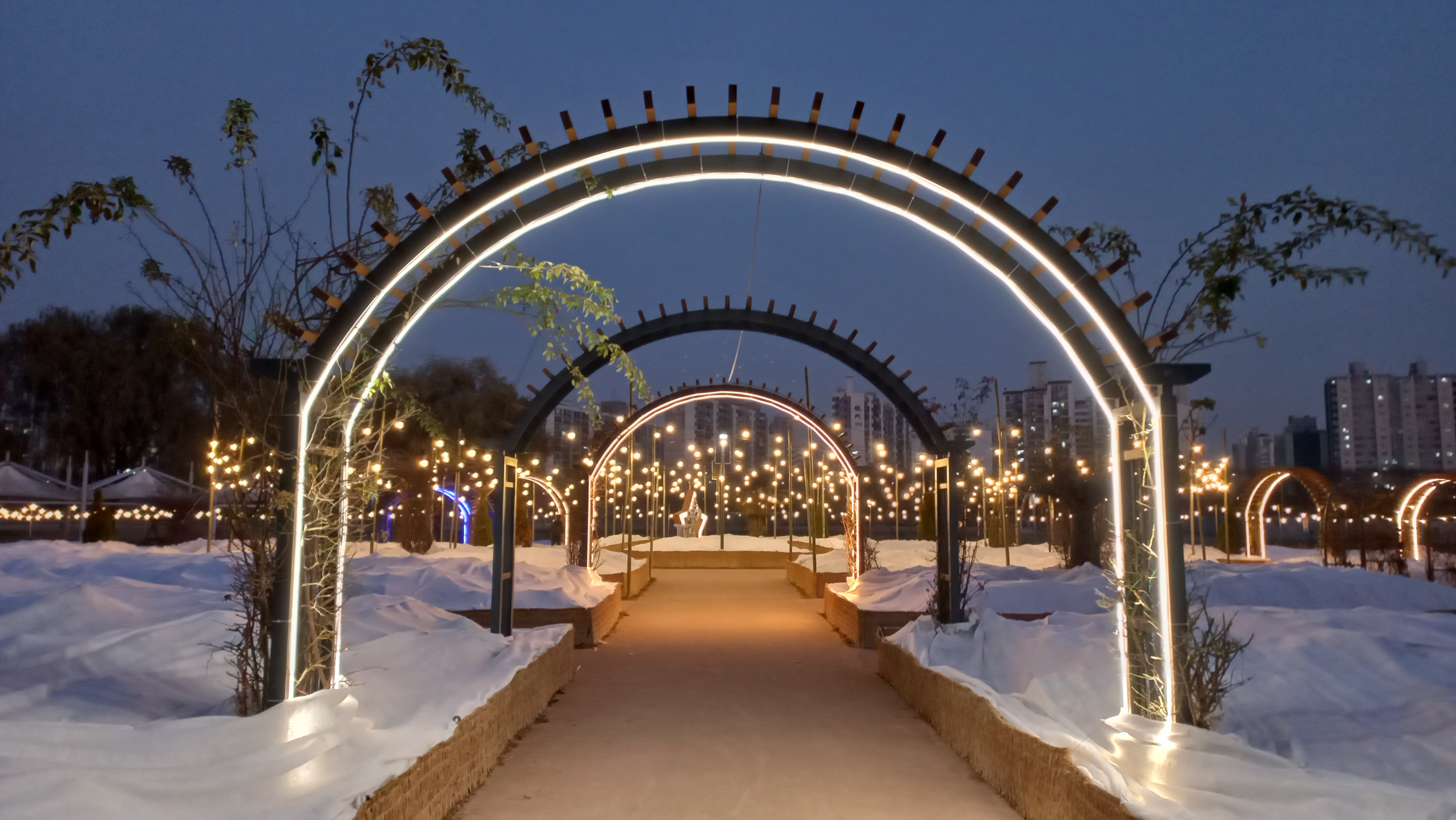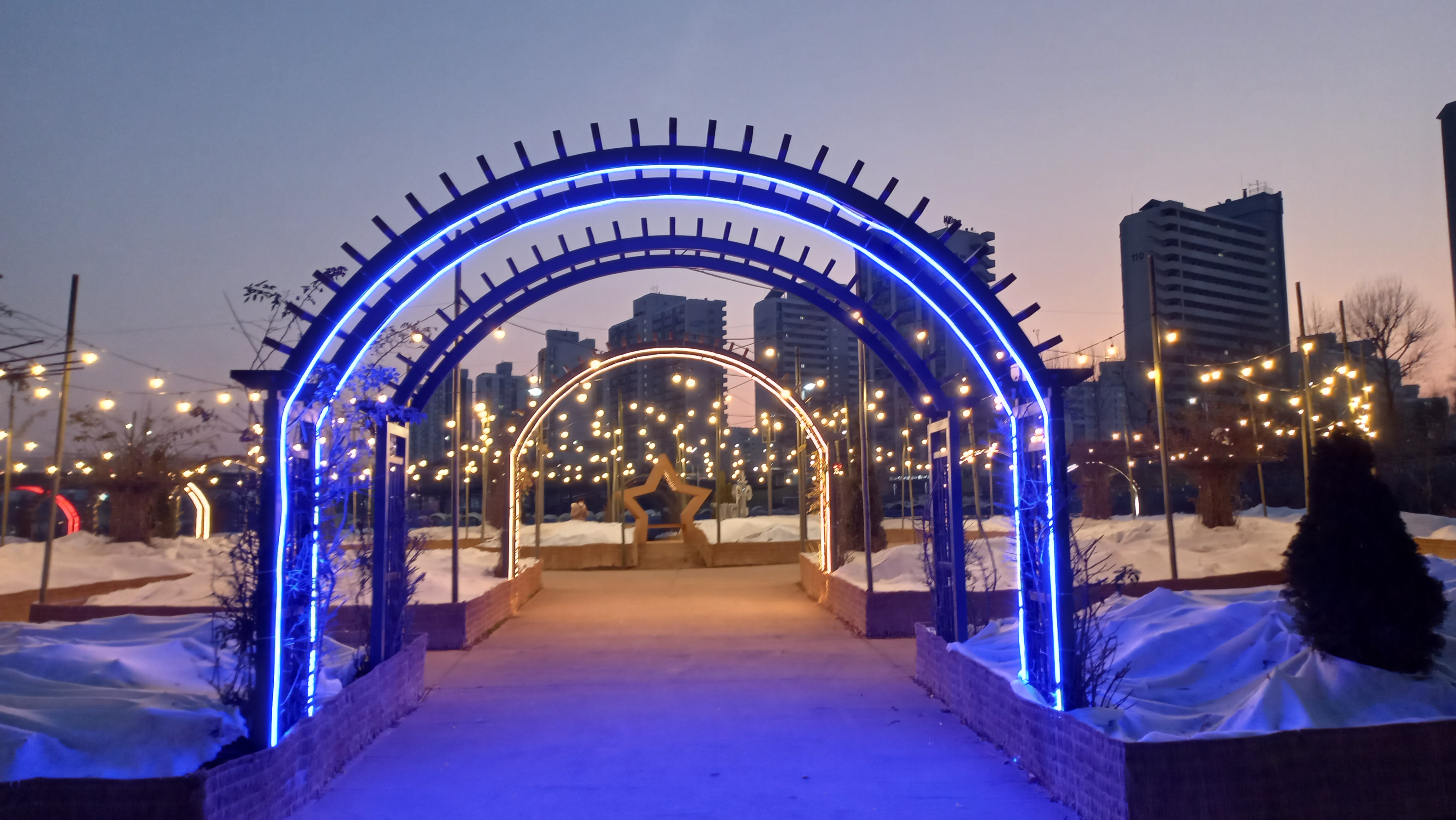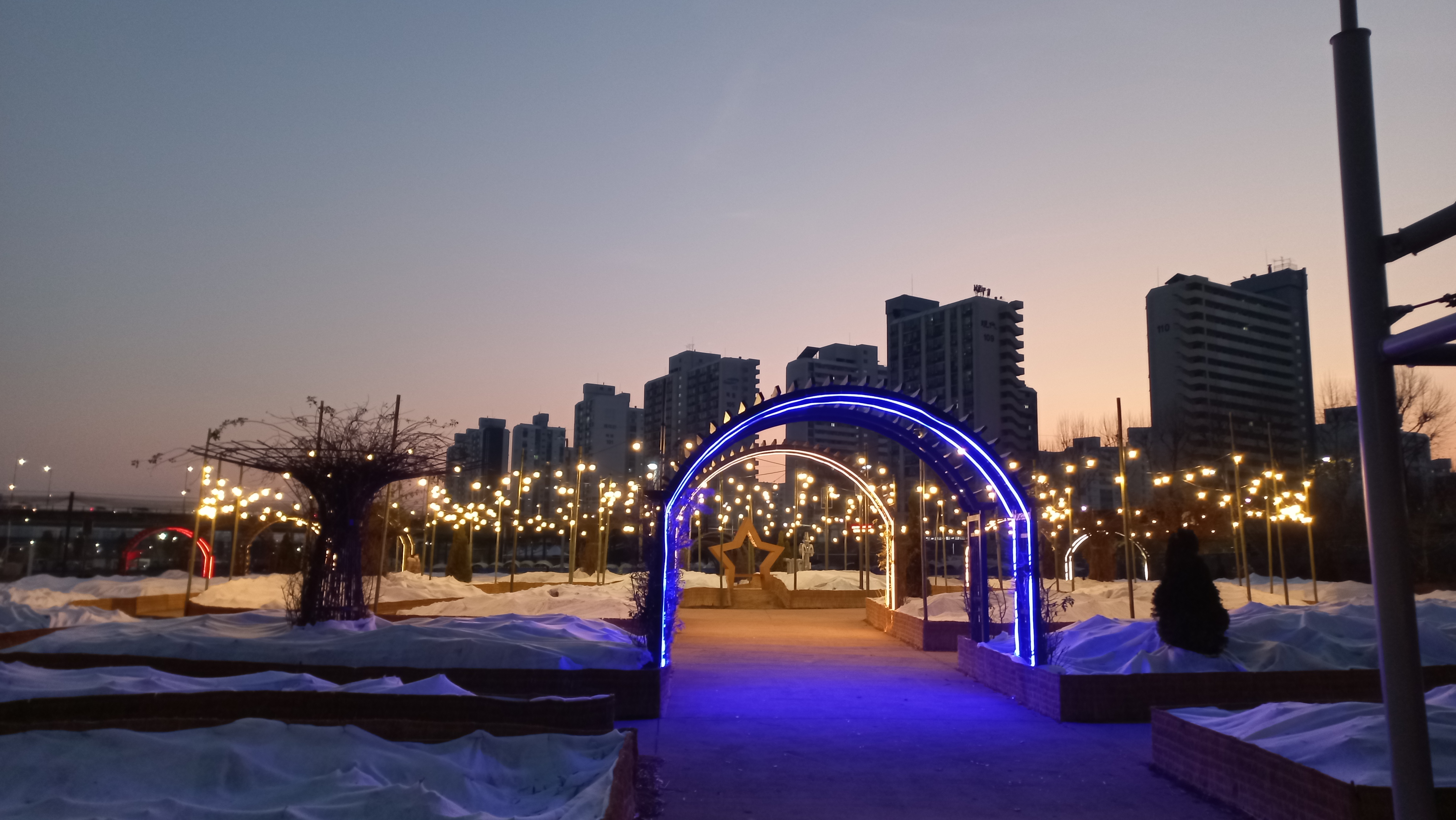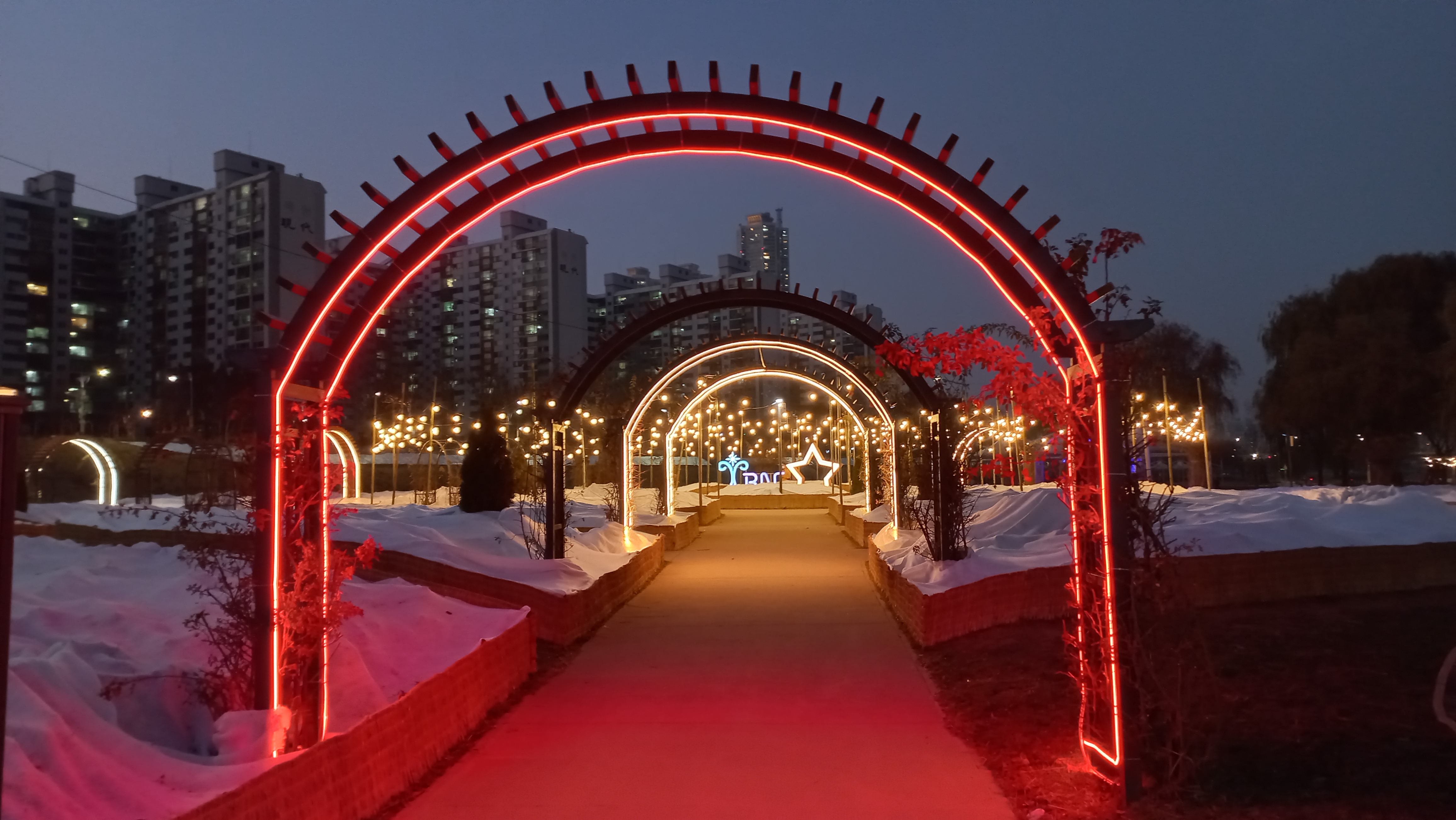 안양천 신정교와 오목교 사이 수변산책로의 안양천 생태공원 장미원에 1100여개의 스트링 조명을 비추고 있는 안양천 베체나라 페스티벌(안양천 빛축제)를 구경해 보세요.