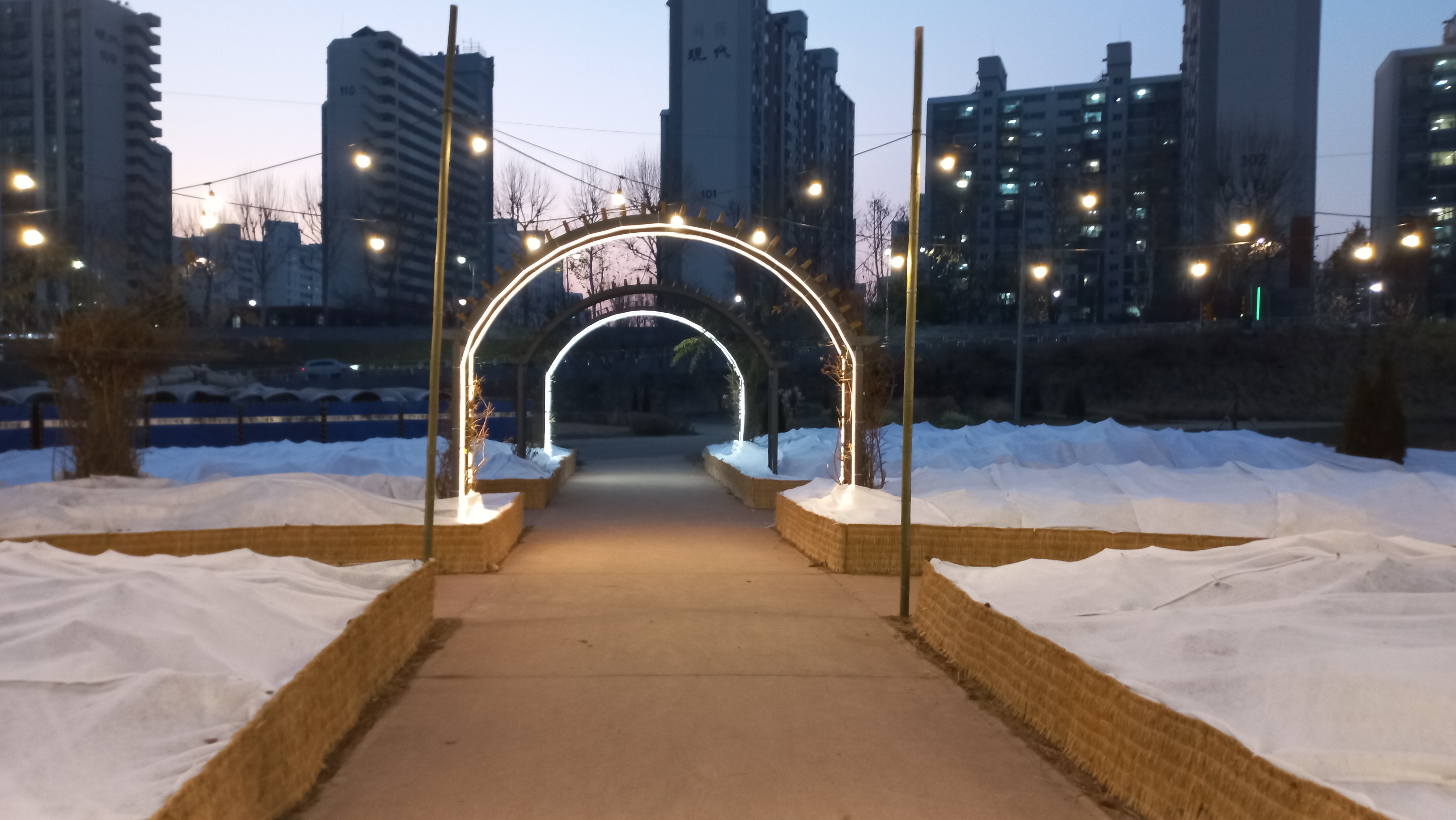 안양천 생태공원 테마원에는 하얀 천으로 덮어 식물들의 겨울나기를 돕기도 하고, 눈이 내린 듯한 풍경을 만들었습니다.