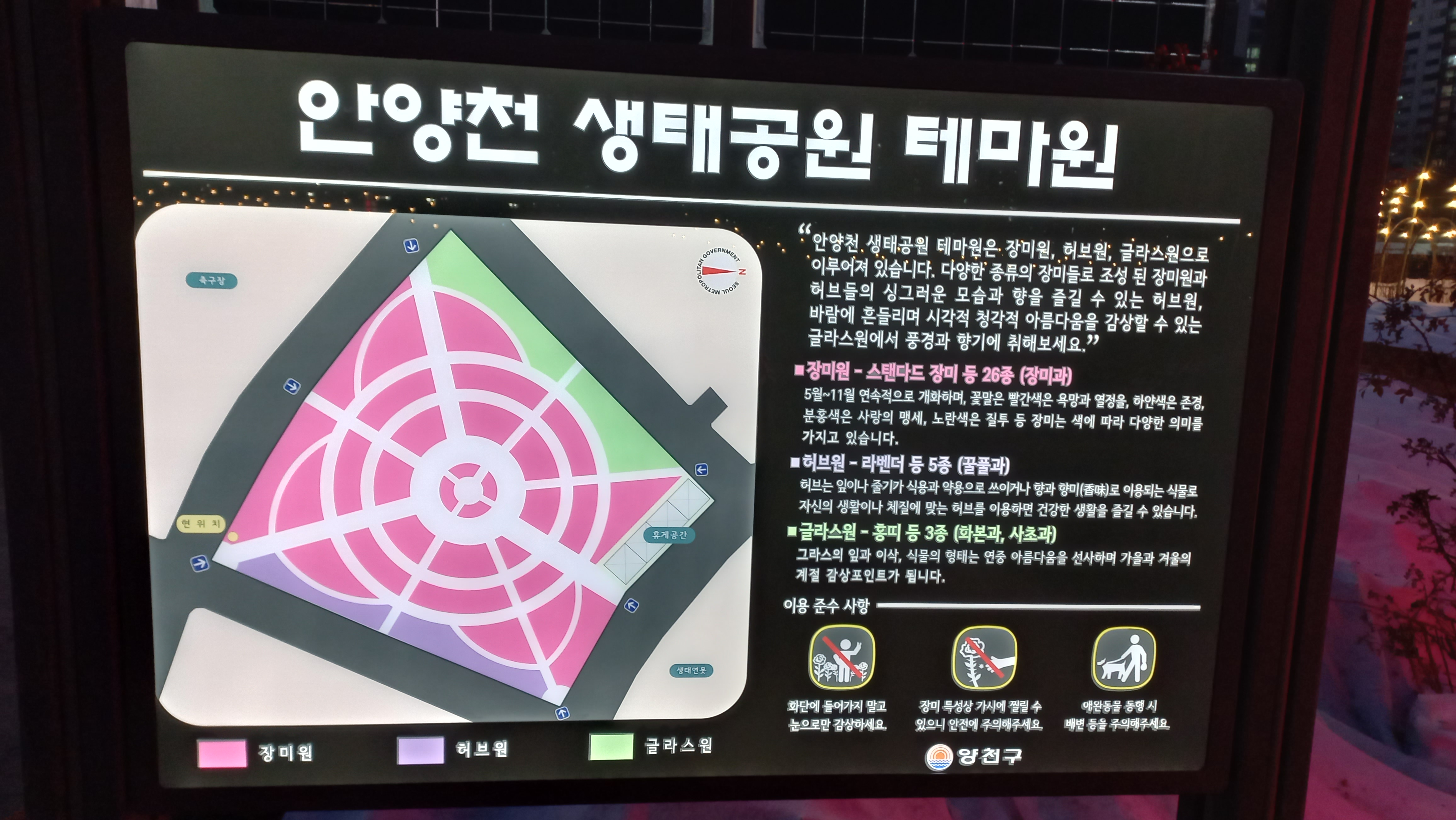 신정동 안양천 생태공원 테마원은 장미원, 하브정원, 글라스원 등으로 이루어져 있는 안양천의 공원입니다.
